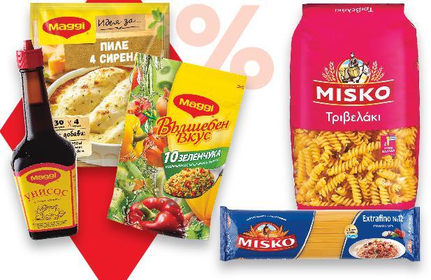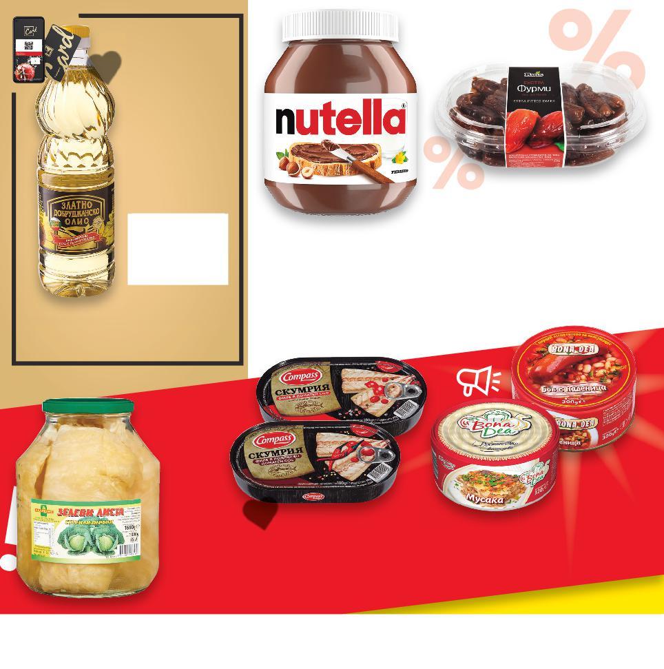Отстъпката с Kaufland Card e изчислена спрямо стандартната текуща цена, на която продуктът се предлага в хипермаркета. Цените са валидни за посочените на последна страница хипермаркети. Стоките се продават в количества, обичайни за едно домакинство. Всички цени са в лева с включен ДДС. Всички артикули се предлагат без декорация. Снимките са примерни. -25% ОТСТЪПКА ЗА ВСИЧКИ ПРОДУКТИ С МАРКА MAGGI -26% 4,79 6,49 -46% 2,29 4,29 -25% 2,69 3,59 -31% 3,69 5,39 -18% 8,99 10,99 -31% 1,99 2,89 2,99 само -32% 3,59 5,29само само 1,68 кг 2 кг ДО 12 БРОЯ НА ПОКУПКА** **При покупка над 12 бр. всеки следващ продукт се продава на стандартна цена. ОСНОВНИ ХРАНИ И КОНСЕРВИ BONA DEA Готово ястие различни видове 300 - 330 г (1 кг = до 7,64) COMPASS Скумрия филе различни видове 170 - 180 г (1 кг = от 14,95) ROIS Фурми без костилка екстра Произход: Алжир 300 г в опаковка (1 кг = 12,30) NUTELLA Лешников крем 700 г (1 кг = 12,85) КАЛИКОНС Зелеви листа 1680 г (1 кг = 2,91) СОФИЯ МЕЛ Брашно екстра 2 кг (1 кг = 1,50) MISKO Макаронени изделия различни видове 500 г (1 кг = 3,98) ЗЛАТНО ДОБРУДЖАНСКО Олио 100% слънчогледово рафинирано 1 л (1 л = 3,59) Цена с KAUFLAND CARD S22-BG-KW03-LFT-NMP1_L-1000-10 22