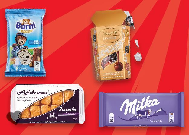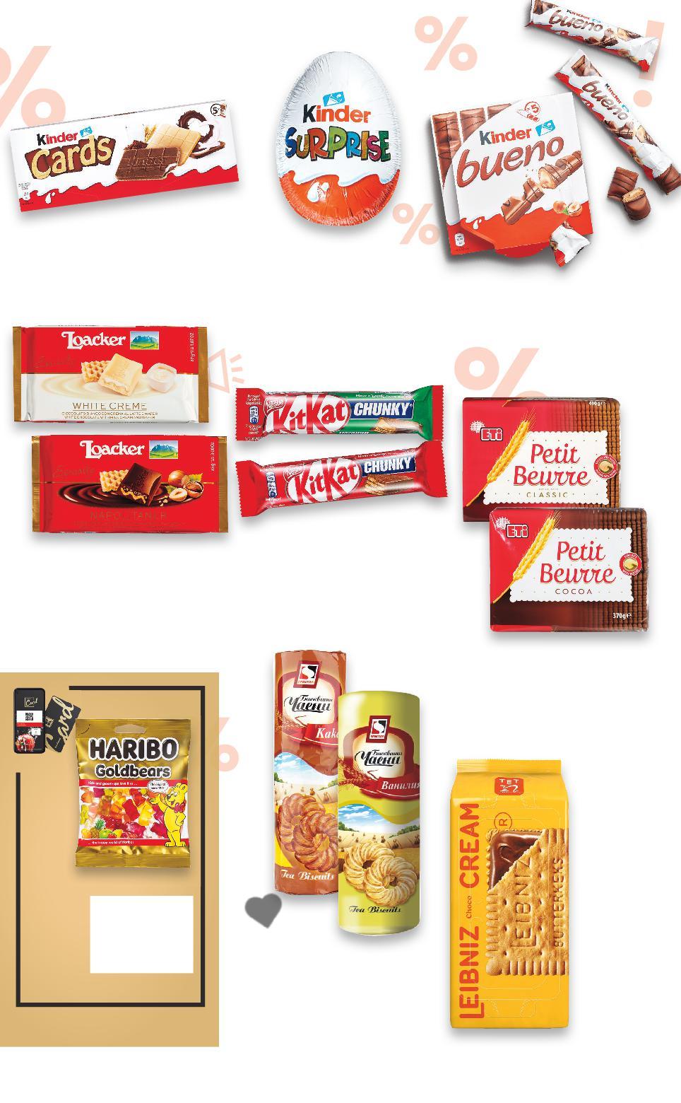 Отстъпката с Kaufland Card e изчислена спрямо стандартната текуща цена, на която продуктът се предлага в хипермаркета. -25% 2,39 3,19 LOACKER Шоколад различни видове 85 - 87 г (1 кг = от 27,48) -33% 1,19 1,79 -22% 2,79 3,59 -42% 1,99 3,49 -32% 2,49 3,69 -23% 3,99 5,19 -28% 0,75 1,05 -21% 1,49 1,89 -28% 1,39 1,95 само с1,95 амо ЗАХАРНИ ИЗДЕЛИЯ КРИСТАЛ Чаени бисквити ванилия, сметана или какао 150 г (1 кг = 7,94) BAHLSEN Бисквити или Вафлени пури различни видове 100 - 190 г (1 кг = от 14,69) ETI Бисквити Petit Beurre класик или какао 370 - 400 г (1 кг = от 4,98) KINDER BUENO Десерт 5 бр. в опаковка 107,5 г (1 кг = 23,28) KINDER CARDS Десерт 128 г (1 кг = 31,18) KINDER SURPRISE Шоколадово яйце с играчка 20 г (1 кг = 74,50) KIT KAT CHUNKY Десерт различни вкусове 40 - 43,5 г (1 кг = до 18,75) HARIBO Бонбони различни видове 100 г (1 кг = 13,90) Цена с KAUFLAND CARD Цените са валидни за посочените на последна страница хипермаркети. Стоките се продават в количества, обичайни за едно домакинство. Всички цени са в лева с включен ДДС. Всички артикули се предлагат без декорация. Снимките са примерни. S26-BG-KW03-LFT-NMP2_L-1000-10 26