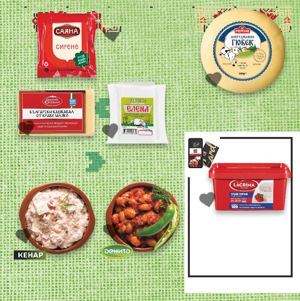 Отстъпката с Kaufland Card e изчислена спрямо стандартната текуща цена, на която продуктът се предлага в хипермаркета. *Със звездичка са обозначени артикулите, които са специално предложение до изчерпване на наличностите. Kaufland не носи отговорност за печатни грешки. Аромат на пелин, бял равнец, бъз, мащерка -53% 5,99 12,99 -45% 7,99 14,79 -30% 11,99 17,29 8,49* само -28% 9,99 13,99 -12% 6,99 7,99 -18% 4,49 5,49 -24% 5,99 7,89 -25% 8,99 с11,99 11,99 амо само 3 литра -39% 16,99 27,99 Салата Боб с лютеница кг (1 кг = 5,99) Катък с печени чушки кг (1 кг = 7,99) МЕРОНЕ Добруджански кашкавал гюбек 500 г (1 кг = 23,98) ДИМИТЪР МАДЖАРОВ Кашкавал от краве мляко по БДС 250 г (1 кг = 33,96) Акациев мед 250 г (1 кг = 27,96) Миш-маш 540 г (1 кг = 8,32) Напитка на винена основа Пелин червен или бял Произход: България, Тракийска низина 3 л BIB (1 л = 3,33) САЯНА Сирене от краве мляко 400 г (1 кг = 14,98) LACRIMA Сирене от краве мляко по БДС 400 г (1 кг = 22,48) Цена с KAUFLAND CARD ЕЛЕНА Сирене от овче мляко вакуум опаковка около 500 г кг (1 кг = 16,99) по традиционна българска рецепта от български пчелини с 22 билки S3-BG-KW03-LFT-BG1_R-1000-10 3