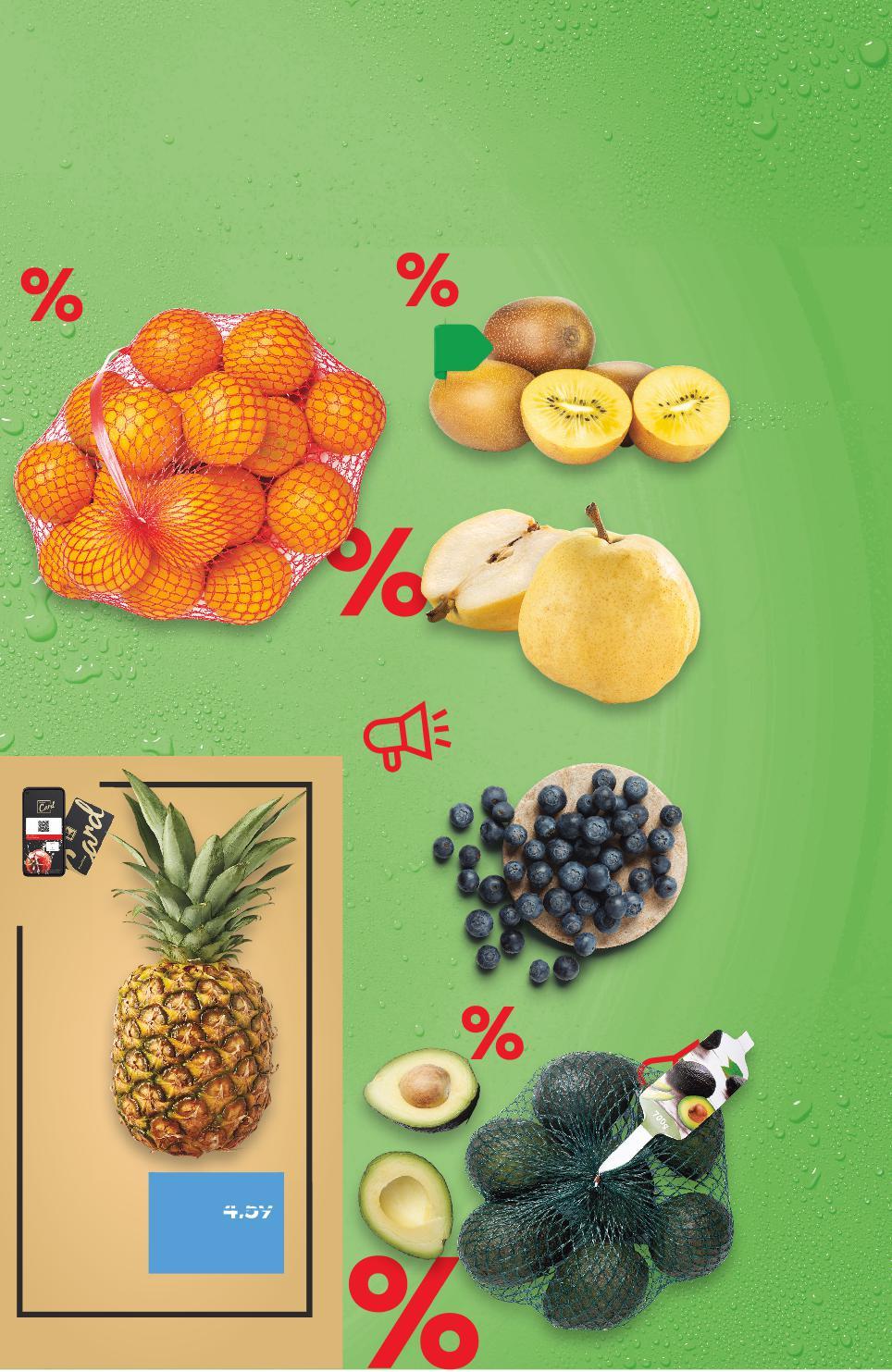 Отстъпката с Kaufland Card e изчислена спрямо стандартната текуща цена, на която продуктът се предлага в хипермаркета. Цените са валидни за посочените на последна страница хипермаркети. Стоките се продават в количества, обичайни за едно домакинство. Всички цени са в лева с включен ДДС. Всички артикули се предлагат без декорация. Снимките са примерни. ПЛОДОВЕ И ЗЕЛЕНЧУЦИ С ПРОВЕРЕНО КАЧЕСТВО 220ДО ** Ново сладко и сочно -30% 3,35 4,79 -30% 2,79 3,99 -25% 4,49 5,99 -32% 3,69 5,49 -46% 1,59 2,99 -23% 3,49 с4,59 4,59 амо само Круши Девеци Клас: I кг Боровинки Клас: I 300 г в опаковка (1 кг = 14,97) Портокали за фреш Клас: I 3 кг в мрежа (1 кг = 1,23) Авокадо Клас: I 500 г в опаковка (1 кг = 6,70) Киви Голд Клас: I 500 г в опаковка (1 кг = 3,18) Ананас Клас: I 1200-1500 г бр. Цена с KAUFLAND CARD ПЛОДОВЕ И ЗЕЛЕНЧУЦИ S10-BG-KW03-LFT-OGP_L-1000-10 10