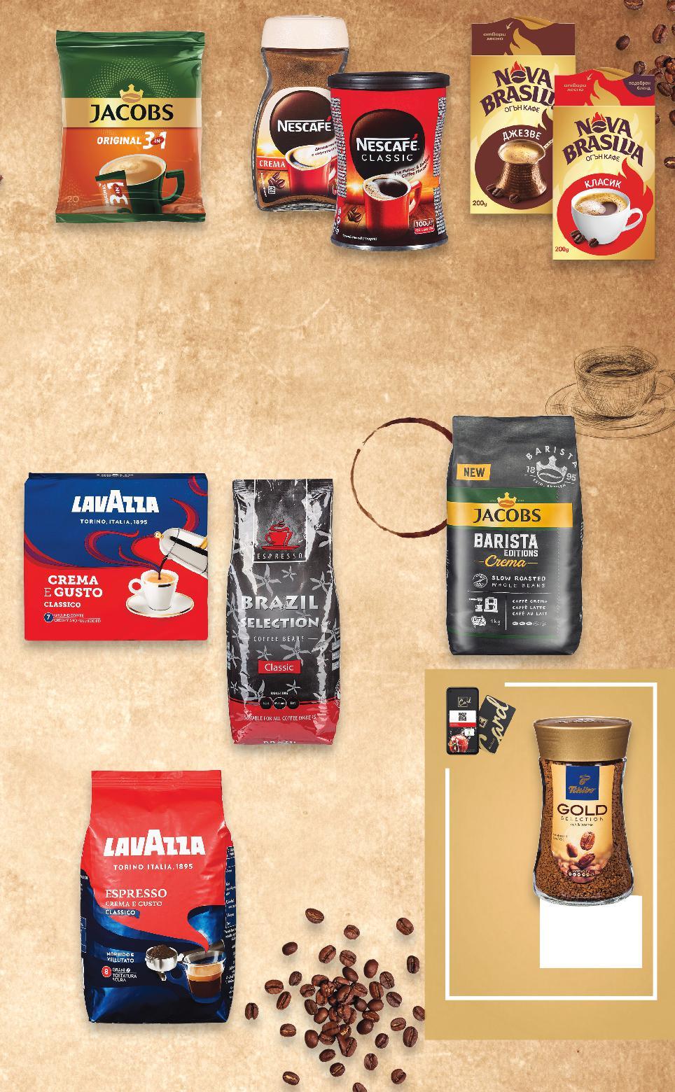 Отстъпката с Kaufland Card e изчислена спрямо стандартната текуща цена, на която продуктът се предлага в хипермаркета. РАЗНООБРАЗИЕ ОТ ВКУСОВЕ 1 кг 2х250 грама 1 кг 1 кг ПРОМОПАКЕТ -30% 2,99 4,29 -38% 4,29 6,99 -44% 26,99 48,29 -26% 21,99 29,99 -44% 13,99 24,99 -21% 10,99 13,99 -35% 5,39 8,39 -37% 8,39 13,49 само NOVA BRASILIA Мляно кафе класик, джезве или Gold 200 г (1 кг = 14,95) NESCAFE CLASSIC Разтворимо кафе различни видове 95 - 100 г (1 кг = от 42,90) JACOBS Кафе на зърна Barista Espresso или Crema 1 кг (1 кг = 26,99) LAVAZZA Кафе на зърна Crema e gusto Espresso италиански селектиран бленд, смес Арабика и Робуста 1 кг (1 кг = 21,99) BRAZIL SELECTION Кафе на зърна 1 кг (1 кг = 13,99) LAVAZZA Мляно кафе Crema e Gusto 2 x 250 г (1 кг = 21,98) JACOBS Разтворимо кафе 3 в 1 20 бр. в опаковка 360 г (1 бр. = 0,27) TCHIBO Разтворимо кафе Gold Selection 200 г (1 кг = 41,95) Цена с KAUFLAND CARD КАФЕ *Със звездичка са обозначени артикулите, които са специално предложение до изчерпване на наличностите. Kaufland не носи отговорност за печатни грешки. S27-BG-KW03-LFT-NMP2_R-1000-10 27
