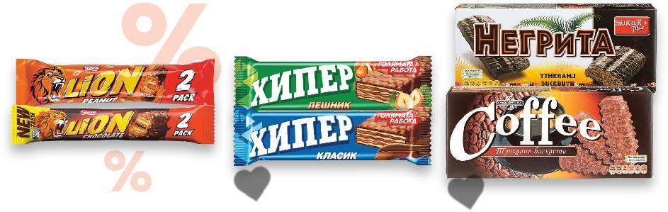 Цените са валидни за посочените на последна страница хипермаркети. Стоките се продават в количества, обичайни за едно домакинство. Всички цени са в лева с включен ДДС. Всички артикули се предлагат без декорация. Снимките са примерни. -30% ОТСТЪПКА ШОКОЛАДОВИЗАБОНБОНИСМАРКАMIESZKO -40% 2,49 4,19 -30% 2,79 3,99 -30% 3,69 5,29 -37% 3,99 6,39 -37% 3,69 5,89 бонбониШоколадовиСЕЗОНИ различни вкусове 156,5 - 160 г (1 кг = от 15,57) бонбониШоколадовиPERGALE различни видове 113 - 117 г (1 кг = до 24,70) бонбониШоколадовиKATY морски фигури с лешников пълнеж 250 г (1 кг = 14,76) БонбониTRUFFLE ягоди или лешник 500 г (1 кг = 7,38) бонбониШоколадовиNESTLE цял лешник или череша 154 - 158 г (1 кг = до 25,91) СВЕТЪТ НА ШОКОЛАДА СЛАДКО РАЗНООБРАЗИЕ НА СЛАДКИ ЦЕНИ UTZ сертификат, природосъобразниягарантиращдобивна какао S26-BG-KW38-LFT-SCHOK2_L-1000-10 26