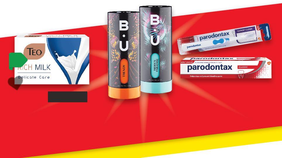 Цените са валидни за посочените на последна страница хипермаркети. Стоките се продават в количества, обичайни за едно домакинство. Всички цени са в лева с включен ДДС. Всички артикули се предлагат без декорация. Снимките са примерни. -27% 3,99 5,49 2,69 само -47% 4,49 8,49-33% 0,99 1,49 -36% 13,99 22,19 -23% 9,99 12,99 -38% 3,89 6,29 -29% 2,69 3,79 -32% 6,99 10,39 БояPALETTEзакоса без амоняк Natural различниColorsцветове 1 бр. AROMA COLOR Боя за коса различни цветове 1 бр. ЧеткаПастаPARОDONTAXилизазъби различни видове 75 мл или 1 бр. (1 л = 59,87) ТоалетнаBU вода различни видове 50 мл (1 л = 279,80) НощенДневенL‘OREALиликрем различни видове 50 мл (1 л = 199,80) ТеченDOVE сапун различни аромати 250 - 500 мл (1 л = от 7,78) TEO СапунMILKRICH различни видове 90 г (1 кг = 11,00) ДушD‘ORIENTETESORIкрем различни видове 500 мл (1 л = 13,98) TEO ШампоанNATURE различни видове 350 мл (1 л = 7,69) Ново КОЗМЕТИКА S30-BG-KW38-LFT-KOZM_L-1000-10 30