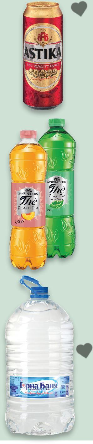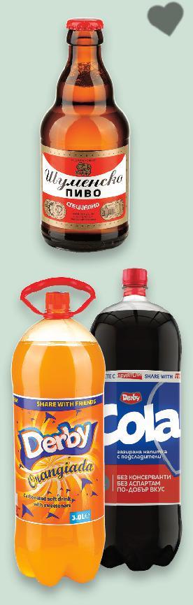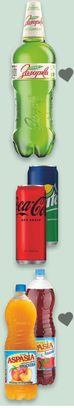 Отстъпката с Kaufland Card e изчислена спрямо стандартната текуща цена, на която продуктът се предлага в хипермаркета. Цените са валидни за посочените на последна страница хипермаркети. Стоките се продават в количества, обичайни за едно домакинство. Всички цени са в лева с включен ДДС. Всички артикули се предлагат без декорация. Снимките са примерни. -40% 0,69 1,15 -32% 0,87 1,29 -33% 2,39 3,59 -50% 1,29 2,59 -30% 1,29 1,85 -35% 2,39 3,69 -23% 0,99 1,29 3 литрa 1,5 литрa 2 литрa 10 литрa 2 литрa -30% 1,99 2,85 2 литра -22% 2,39 с3,09 3,09 амо само ШУМЕНСКО Бира 5,2% vol * Цената не включва амбалаж * Цена на амбалаж 0,10 лв. 0,33 л бутилка (1 л = 2,10) ASTIKA Бира Fine Quality Lager 4,3% vol 0,5 л кен (1 л = 1,74) ГОРНА БАНЯ Минерална вода 10 л РЕТ (1 л = 0,24) ASPASIA Негазирана напитка различни видове 2 л PET (1 л = 0,65) DERBY Газирана напитка различни видове 3 л PET (1 л = 0,43) SAN BENEDETTO Студен чай различни видове 1,5 л PET (1 л = 1,60) COCA COLA/ FANTA/ SPRITE/ SCHWEPPES Газирана напитка различни видове 0,33 л кен (1 л = 3,00) ЗАГОРКА Бира Специално 5% vol 2 л PET (1 л = 1,00) CIAO Плодова напитка различни вкусове 2 л (1 л = 1,20) Цена с KAUFLAND CARD БЕЗАЛКОХОЛНИ НАПИТКИ И БИРА S24-BG-KW02-LFT-NMP3_L-1000-10 24