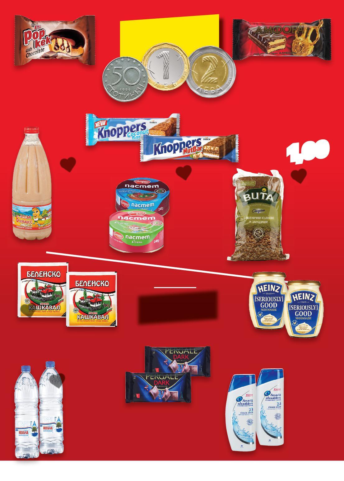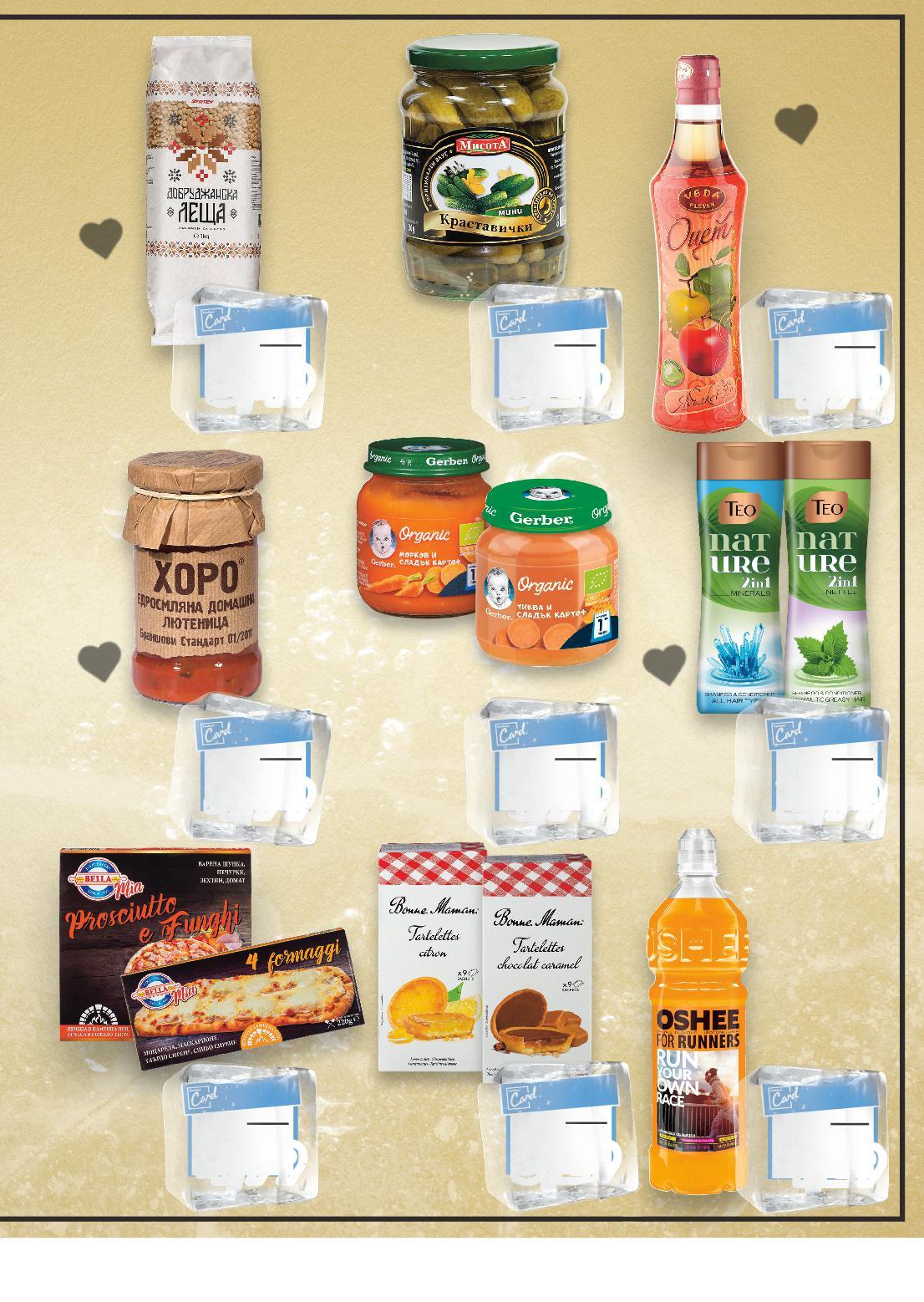 Цените са валидни за посочените на последна страница хипермаркети. Стоките се продават в количества, обичайни за едно домакинство. Всички цени са в лева с включен ДДС. Всички артикули се предлагат без декорация. Снимките са примерни. ПО Е ВЗЕМИ 1+1 ЛЕВА ВСИЧКО При „Вземи 1+1 повече“ вземи четен брой от артикула на половин цена. -33% 2,99 -32% 1,49 -43% 0,89 -47% 1,89 -50% 12,49 24,98 -50% 11,99 23,98 -36% 0,79 -28% 2,79 -50% 0,99 1,98 -50% 15,89 31,78 -50% 2,29 4,58 0,50 0,50 0,50 0,50 1,00 1,00 2,00 2,00 1,00 2,00 2,00 COMPASS Пастет различни видове 240 г (1 кг = 8,34) KNOPPERS Шоколадов десерт с лешници, фъстъци или кокос 40 г (1 кг = 25,00) ETI Кейк какао Popkek 45 г (1 кг = 11,12) БОМАКС Боза 1 л (1 л = 1,00) HEINZ Майонеза класик 2 x 710 мл (1 л = 8,80) БЕЛЕНСКО Кашкавал от краве мляко 2 x 400 г (1 кг = 14,99) АМФОРА Суха паста крем какао 70 г (1 кг = 7,15) ВИТА СИЛУЕТ Хляб различни видове 400 г (1 кг = 5,00) ХИСАР Минерална вода РЕТ 2 х 1,5 л (1 л = 0,33) PERGALE Шоколад различни видове 2 х 93 - 100 г (1 кг = от 11,45) HEAD & SHOULDERS Шампоан различни видове 2 x 675 мл (1 л = 11,78) НА ЦЕНАТА НА 1 НА ЦЕНАТА НА 1 НА ЦЕНАТА НА 1 НА ЦЕНАТА НА 1 НА ЦЕНАТА НА 1 ВЗЕМИ 2 ВЗЕМИ 2 ВЗЕМИ 2 ВЗЕМИ 2 ВЗЕМИ 2 S2-BG-KW02-LFT-XXL1_L-1000-10 2