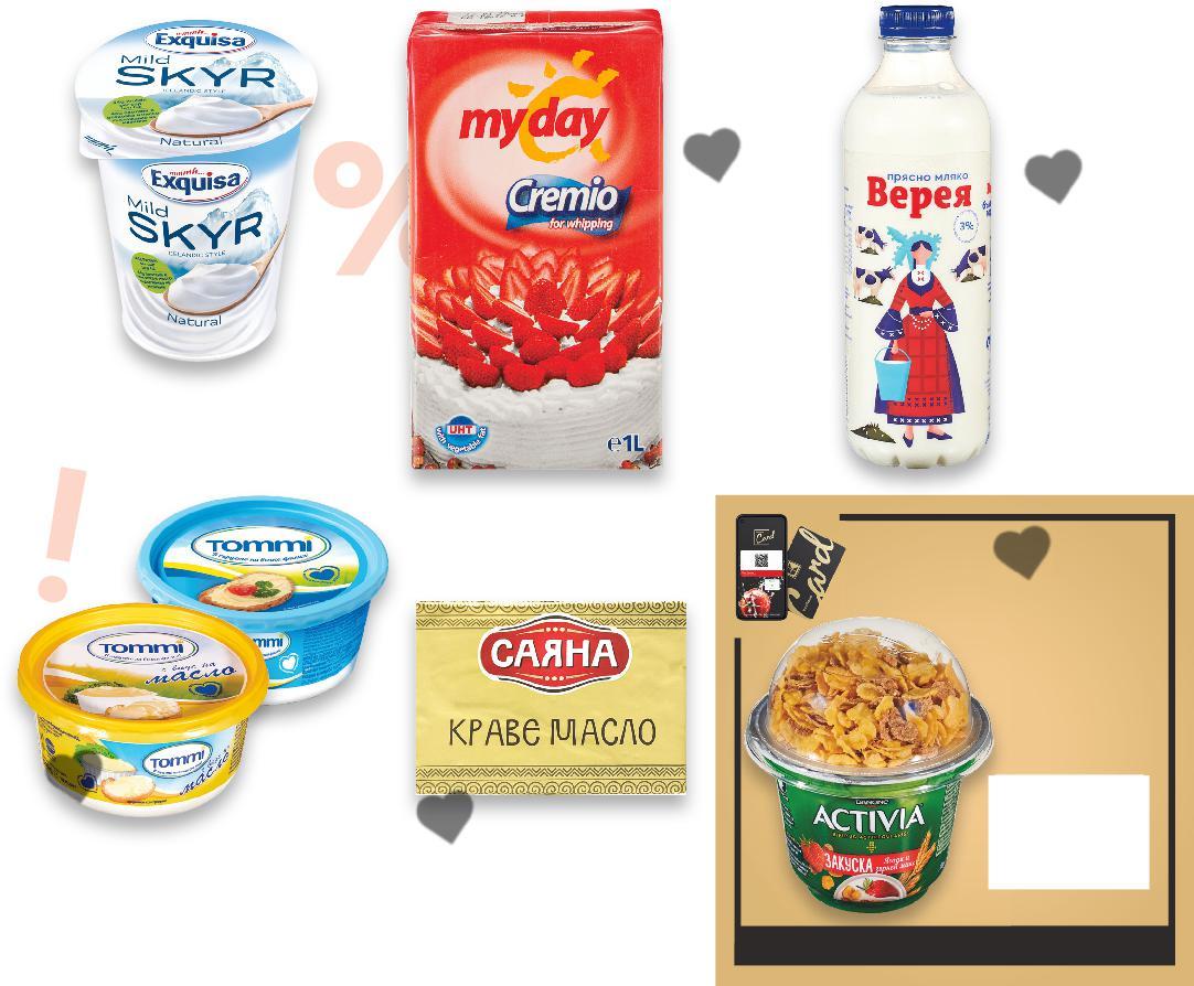 Отстъпката с Kaufland Card e изчислена спрямо стандартната текуща цена, на която продуктът се предлага в хипермаркета. *Със звездичка са обозначени артикулите, които са специално предложение до изчерпване на наличностите. Kaufland не носи отговорност за печатни грешки. Отстъпката с Kaufland Card e изчислена спрямо стандартната -23% 3,19 4,19 -10% 1,69 1,89 -30% 4,69 6,79 -33% 1,99 2,99 -18% 2,59 3,19 -25% 5,75 7,69 -28% 2,99 4,19 -25% 1,19 1,59 -20% 1,59 1,99 само с1,99 амо МЛЕЧНИ И РАСТИТЕЛНИ ПРОДУКТИ OLYMPUS Заквасена сметана 20% масленост 350 г (1 кг = 9,12) ДОМЛЯН Кисело мляко 4,5% масленост 500 г (1 кг = 3,38) САЯНА Краве масло 82% масленост 250 г (1 кг = 18,76) TOMMI Продукт за мазане 25% масленост или с вкус на масло 500 г (1 кг = 3,98) ВЕРЕЯ Прясно мляко 3% масленост 1 л (1 л = 2,59) MY DAY Крем за разбиване Cremio 1 л (1 л = 5,75) EXQUISA Скир натурален 400 г (1 кг = 7,48) БУЛГАРЧЕ Кисело мляко 3,6% малсеност 400 г (1 кг = 2,98) DANONE Активиа Закуска различни вкусове 198 г (1 кг = 8,04) Цена с KAUFLAND CARD S19-BG-KW02-LFT-BACK_R-1000-10 19