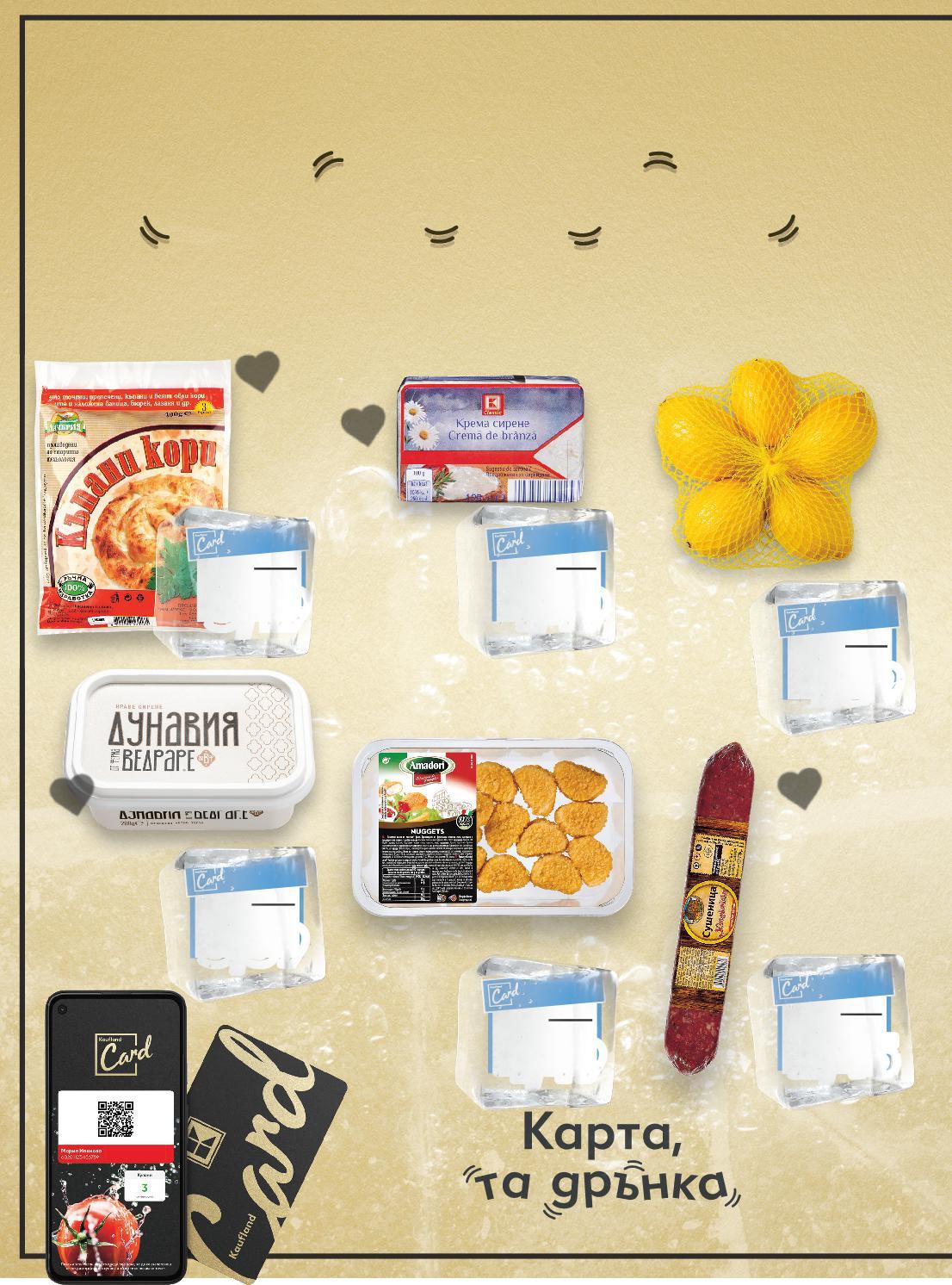 Отстъпката с Kaufland Card e изчислена спрямо стандартната текуща цена, на която продуктът се предлага в хипермаркета. Цените са валидни за посочените на последна страница хипермаркети. Стоките се продават в количества, обичайни за едно домакинство. Всички цени са в лева с включен ДДС. Всички артикули се предлагат без декорация. Снимките са примерни. 10,99* само -14% 11,99 13,99 5,49 само -29% 5,99 8,49 -23% 11,99 15,59 -28% 4,99 6,99 6,99 само -17% 5,49 6,69 -25% 2,49 3,35 само с3,35 амо Поркета руло от свинско контрафиле с бейбизеленчуци и подправки кг (1 кг = 10,99) FRAGEDO Пилешко филе от гърди охладено кг (1 кг = 11,99) ЛУДОГОРСКО ПИЛЕ Цяло пиле охладено кг (1 кг = 5,49) MAKLER Сирене Даная от краве мляко 400 г (1 кг = 14,98) FREZCO Сирене от краве мляко по БДС 700 г (1 кг = 17,13) Свински крака охладени вакуум опаковка около 1,8 кг кг (1 кг = 4,99) Петроханска наденица охладена 480 г (1 кг = 14,57) Кебапчета или Кюфтета смес 480 г (1 кг = 11,44) CASA DELIZIOSA Моцарела Произход: Германия 125 г (1 кг = 19,92) Цена с KAUFLAND CARD МЕСО ОТ ВИТРИНА НА САМООБСЛУЖВАНЕ СИРЕНЕ И КАШКАВАЛ ОТ ВИТРИНА НА САМООБСЛУЖВАНЕ стандарт „Стара планина“ S14-BG-KW02-LFT-SB_L-1000-10 14
