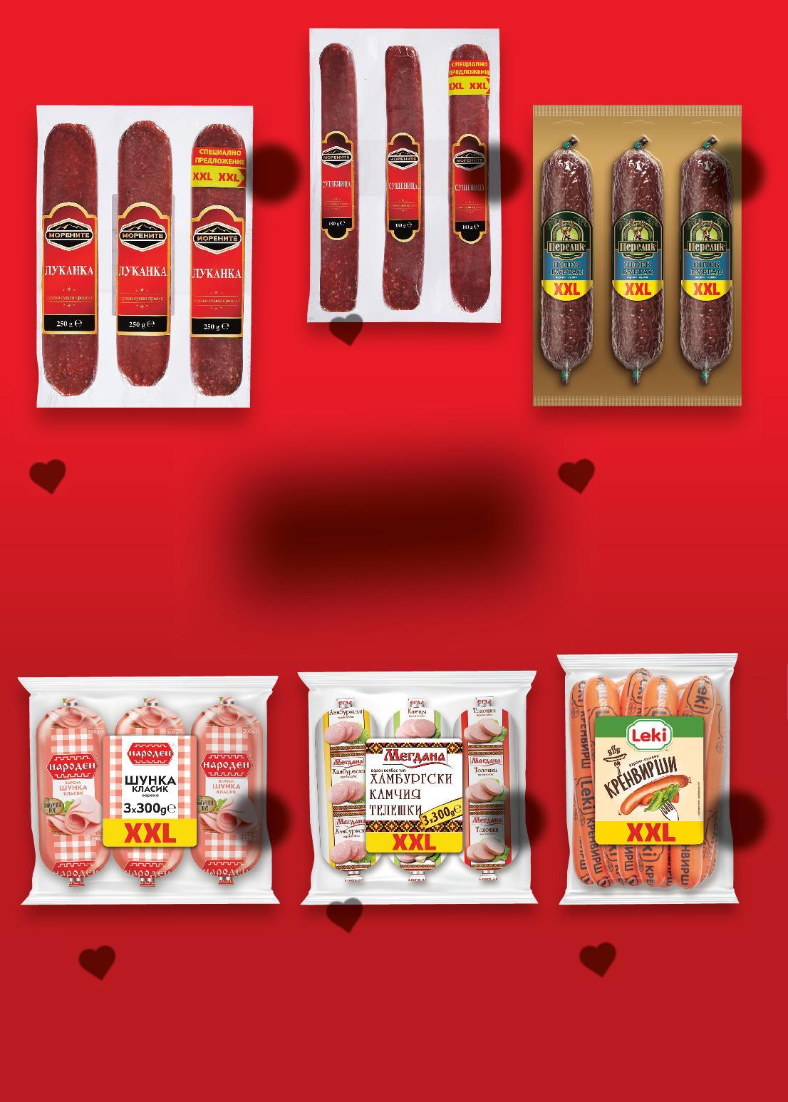 Цените са валидни за посочените на последна страница хипермаркети. Стоките се продават в количества, обичайни за едно домакинство. Всички цени са в лева с включен ДДС. Всички артикули се предлагат без декорация. Снимките са примерни. Р З Р XXL СПЕСТЯВАЙ В 7,95* само 7,69* само 7,99* само 4,49* само 6,99* само 8,99* само 3x250 грама 3x300 грама 3x300 грама 3x180 грама 3x200 грама около 1 кг МОРЕНИТЕ Луканка 3 х 250 г (1 кг = 10,60) МОРЕНИТЕ Сушеница 3 х 180 г (1 кг = 14,25) ЛЕКИ Кренвирши кг (1 кг = 7,99) МЕГДАНА Телешки, Хамбургски и колбас Камчия 3 х 300 г (1 кг = 4,99) НАРОДЕН Шунка 3 х 300 г (1 кг = 7,77) ПЕРЕЛИК Шпек Бургас 3 х 200 г (1 кг = 14,99) ПРОМОПАКЕТ ПРОМОПАКЕТ ПРОМОПАКЕТ ПРОМОПАКЕТ ПРОМОПАКЕТ ПРОМОПАКЕТ S4-BG-KW02-LFT-XXL2_L-1000-10 4
