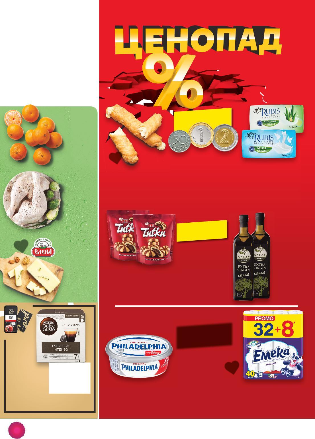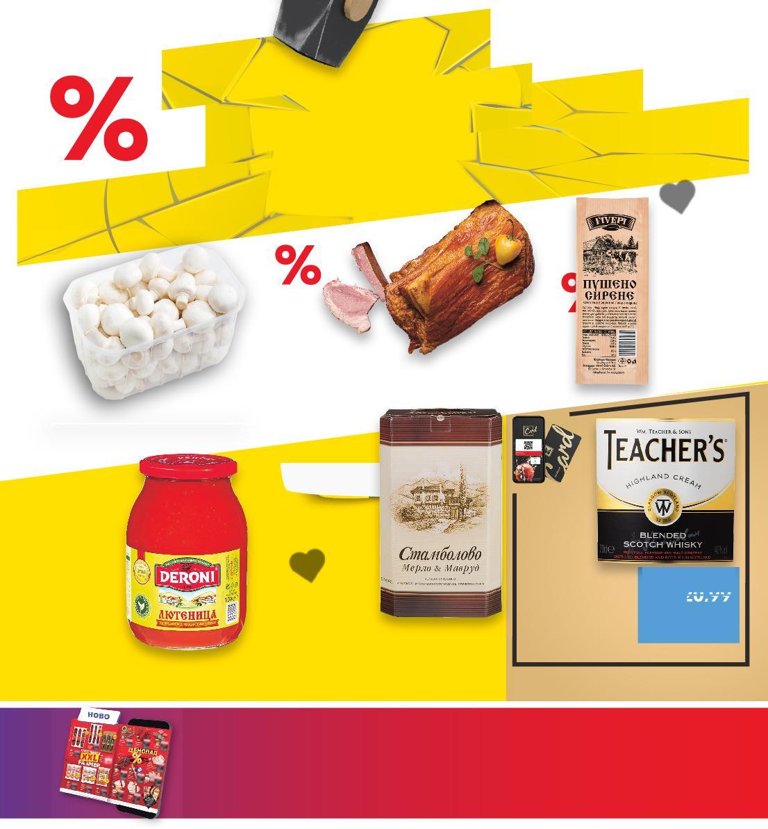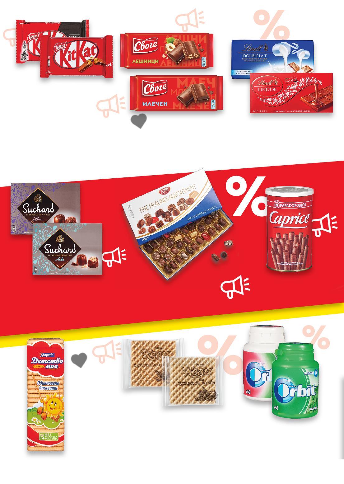 Цените са валидни за посочените на последна страница хипермаркети. Стоките се продават в количества, обичайни за едно домакинство. Всички цени са в лева с включен ДДС. Всички артикули се предлагат без декорация. Снимките са примерни. ЗАХАРНИ ИЗДЕЛИЯ НАД 1100 ЗАХАРНИ ИЗДЕЛИЯ ИМА ПРИ НАС -22% 0,89 1,15 -21% 3,49 4,45 -25% 2,99 3,99 -27% 1,29 1,79 -35% 1,09 1,69 -30% 2,69 3,85 -20% 3,99 4,99 -27% 1,29 1,79 -21% 2,99 3,79 KIT KAT Десерт Fingers различни видове 41,5 г (1 кг = 21,71) SUCHARD Шоколадови бонбони различни видове 126 - 153 г (1 кг = от 22,82) ХЕЛИ Вафли с халва, сусамова халва или фъстъчен тахан 8 бр. в опаковка 158 - 168 г (1 кг = от 7,68) КАРМЕЛА Обикновени бисквити Детство мое 200 г (1 кг = 5,45) CAPRICE Минипури шоколадови 115 г (1 кг = 23,40) KATY Шоколадови бонбони асорти 400 г (1 кг = 9,98) ORBIT Дъвки драже различни вкусове 46 бр. в опаковка 64 г (1 кг = 46,72) LINDT Шоколад избрани видове 100 г (1 кг = 29,90) СВОГЕ Шоколад различни видове 80 - 90 г (1 кг = 16,13) S22-BG-KW02-LFT-NMP2_L-1000-10 22