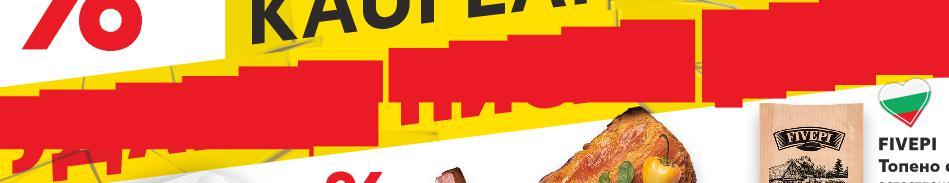 *Със звездичка са обозначени артикулите, които са специално предложение до изчерпване на наличностите. Kaufland не носи отговорност за печатни грешки. -25% ОТСТЪПКА ЗА ИЗБРАНИ КОЛБАСИ С МАРКА НАРОДЕН -36% 18,99 29,89 -31% 25,99 37,99 -39% 19,89 32,89 -37% 9,99 15,99 -40% 9,49 15,99 -47% 4,99 9,49 -33% 27,99 41,99 -25% 15,99 21,59 26,99* само Свинско филе от ръчно обезкостено месо запечено - с карамелена коричка кг (1 кг = 18,99) Телешки суджук сурово-сушен по традиционна рецепта кг (1 кг = 25,99) Шпек Класик или Бургас варено-пушен от свинско и говеждо месо с чесън кг (1 кг = 19,89) Пилешко роле кг (1 кг = 9,99) Свинска плешка варено-пушена кг (1 кг = 9,49) Шунка кг (1 кг = 4,99) Горнооряховски пръчици сурово-сушени от свинско месо кг (1 кг = 15,99) Филе Елена сурово-сушенo от свинско контра филe кг (1 кг = 26,99) Луканка Леденика кг (1 кг = 27,99) от 100% телешко месо S5-BG-KW02-LFT-XXL2_R-1000-10 5
