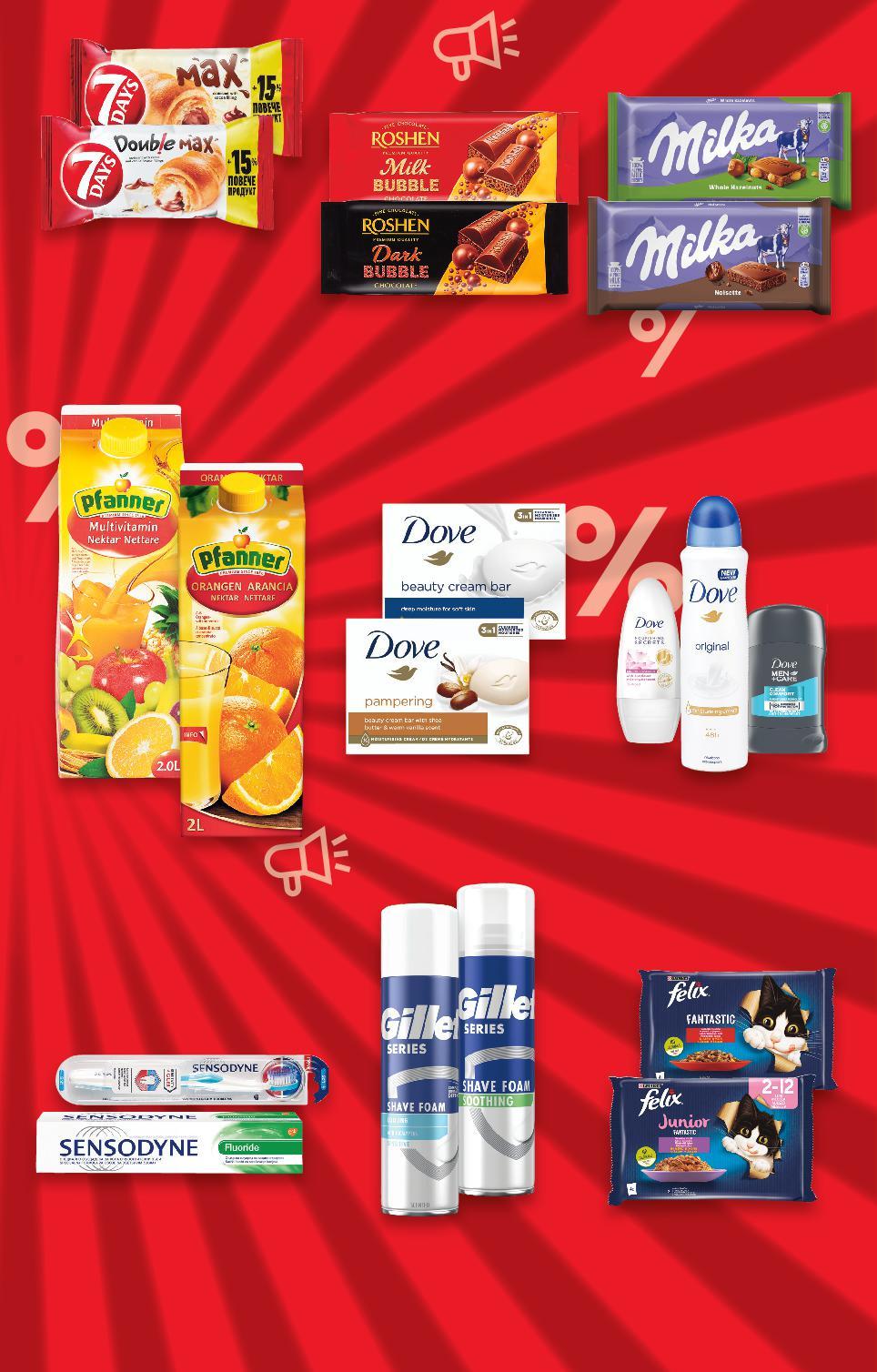 Четка за зъби 1 бр. различни видове (1 л = 58,54) DOVE Крем сапун различни видове 90 г (1 л = 15,45) MILKA Шоколад избрани видове 85 - 100 г (1 кг = от 19,90) DOVE Дезодорант спрей, ролон или стик различни видове 40 - 150 мл (1 л = от 32,60) 7 DAYS MAX DOUBLE Кроасан различни вкусове 80 г + 15% повече 92 г (1 кг = 13,59) S3-BG-KW05-LFT-TOP_R-1000-10 3