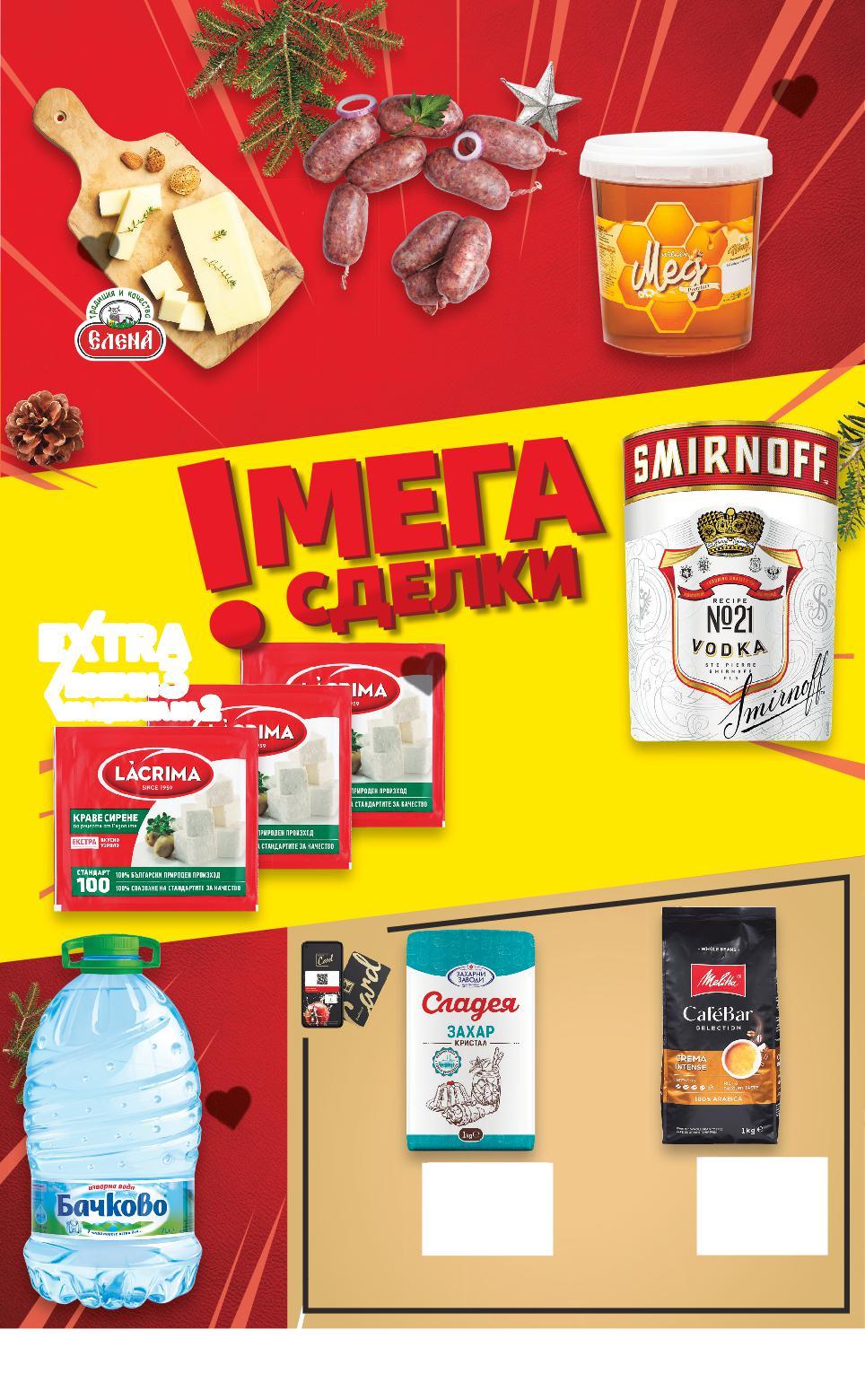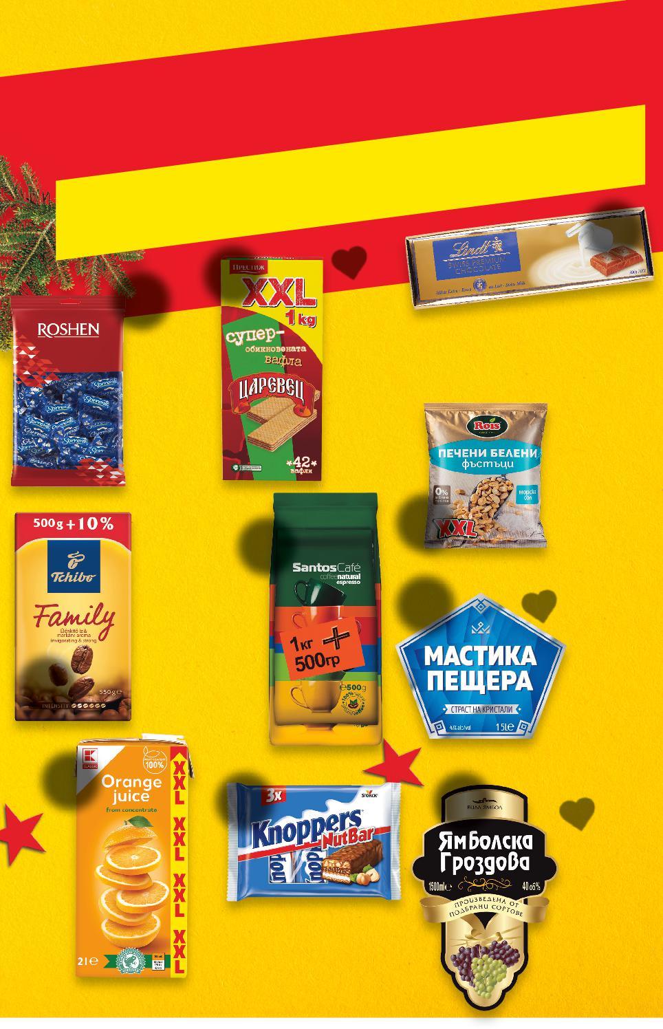 XXL РАЗМЕР ИЗГОДНО Цените са валидни за посочените на последна страница хипермаркети. Стоките се продават в количества, обичайни за едно домакинство. Всички цени са в лева с включен ДДС. Всички артикули се предлагат без декорация. Снимките са примерни. 1+500 кг 2 кг 1 кг 1,5 литра 1,5 литра 2 литра 500+50 грама 300 грама 500 грама 120 грама 2,89* само -20% 17,99 22,49 -15% 8,19 9,69 4,99* само -28% 17,99 24,99 3,49* само 4,89* само 16,79* само -37% 5,99 9,59 14,99* само KNOPPERS NUTBAR Десерт с лешници 3 бр. в опаковка 120 г (1 кг = 24,09) ЯМБОЛСКА Гроздова 40% vol 1,5 л (1 л = 12,00) LINDT Шоколад млечен 300 г (1 кг = 27,30) ЦАРЕВЕЦ Обикновени вафли 1 кг (1 кг = 4,99) Сок 100% портокал 2 л (1 л = 1,75) ROIS Фъстъци печени с морска сол или сметана и пипер 500 г (1 кг = 9,78) SANTOS CAFÉ Кафе на зърна Natural 1 кг + 500 г (1 кг = 11,20) TCHIBO FAMILY Мляно кафе 500 + 50 г (1 кг = 10,90) ПЕЩЕРА Мастика 47% vol 1,5 л (1 л = 12,00) ROSHEN Шоколадови бонбони Соренто или Ромашка 2 кг (1 кг = 7,50) XXL ПРЕДЛОЖЕНИЯ S8-BG-KW46-LFT-XXL3_L-1000-10 8