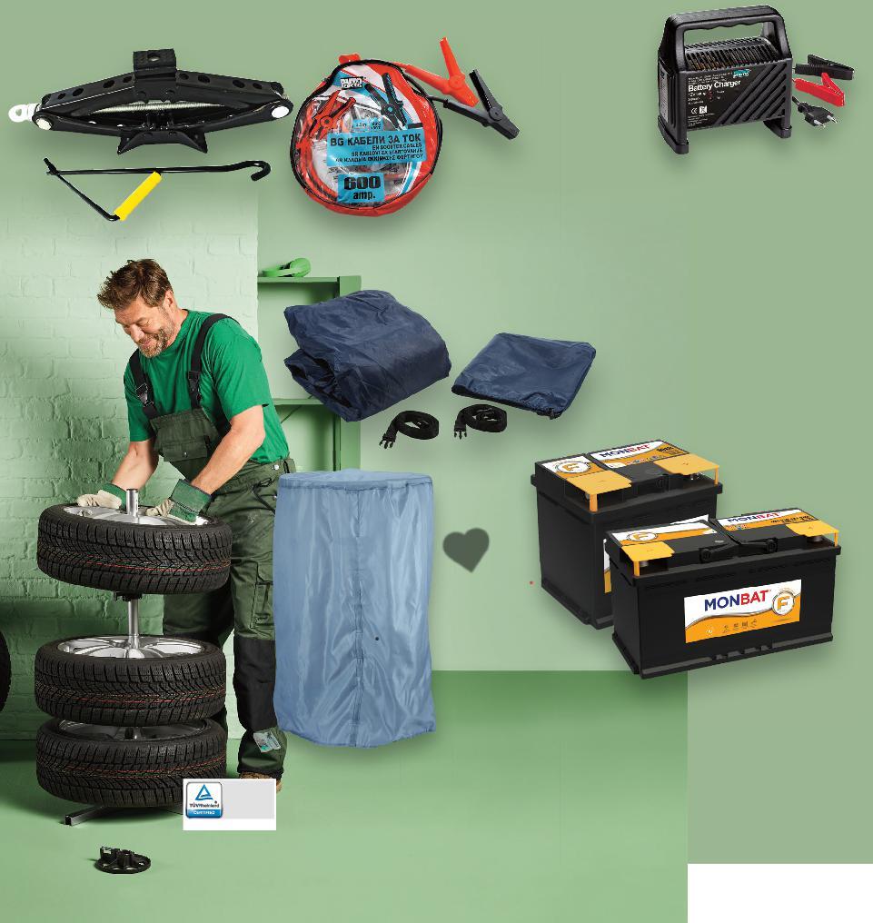 ИЗГОДНА ЗИМНА ПРЕМЯНА ЗА АВТОМОБИЛА Цените са валидни за посочените на последна страница хипермаркети. Стоките се продават в количества, обичайни за едно домакинство. Всички цени са в лева с включен ДДС. Всички артикули се предлагат без декорация. Снимките са примерни. 27,99 само -41% 34,99 59,99 -18% 89,99 109,90 19,99 само 29,99* само 34,99* само 27,99* само 19,99 само 139,90 109,90 -44% 27,99 49,99 169,90* AUTO PRACTIC Зарядно устройство акумулатор за зареждане на 6 V или 12 V/ 6 A, за оловно-киселинни акумулатори 15Ah - 80Ah, LED индикация за зареждане, защита от късо съединение и прегряване, входно напрежение /220 - 240 V, 50 - 60 Hz/ **Важи само 2 години законова гаранция. Гаранцията за електроуреди, описана на Kaufland.bg, не е приложима. Моторно масло 15W40 за бензинови и дизелови двигатели (с или без турбо), Произведено в Германия Моторно масло 10W40 подходящо за бензинови и дизелови двигатели (с или без турбо) Произведено в Германия Стойка за гуми до 18“ и 225 мм ширина, предотвратява деформацията на гумите Миникомпресор с шлаух, манометър и 4 адаптера, налягане до 10 bar/150 PSI, 30 л/мин., 14 А, 108 W Покривало за автомобил водоустойчиво, UV устойчив материал, размер S/M AUTO PRACTIC Механичен крик натоварване до 1 тон FORMULA Акумулатор 12 V, необслужваем Кабели за ток 600 А, дължина 3,5 м 129,90 -15% 65Ah, стартов ток 570 A 159,90 -12% 75Ah, стартов ток 700 A само 100Ah, стартов ток 820 A 50Ah, стартов ток 450 A 2 години гаранция ** 5 литра 5 литра S44-BG-KW46-LFT-NFP3_L-1000-10 44
