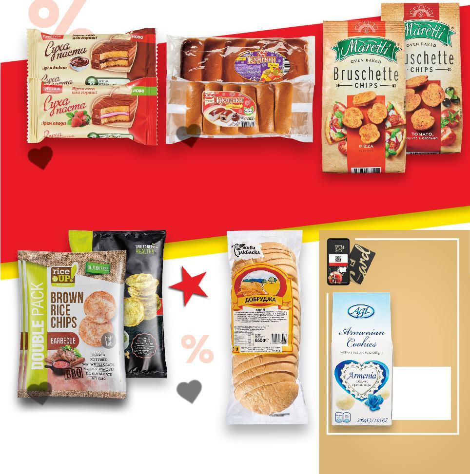 Цените са валидни за посочените на последна страница хипермаркети. Стоките се продават в количества, обичайни за едно домакинство. Всички цени са в лева с включен ДДС. Всички артикули се предлагат без декорация. Снимките са примерни. ЗАДЪЛЖИТЕЛЕН ТЕСТ И ПРОБНО ПЕЧЕНЕ НА ВСЕКИ НОВ ПРОДУКТ ПРЯСНО ИЗПЕЧЕНИ ХЛЕБЧЕТА И ЗАКУСКИ ВЪВ ВСЕКИ МОМЕНТ ОТ ДЕНЯ КАЧЕСТВЕНИ ПЕЧИВА 0,55 само -44% 0,10 0,18 1,99 само 0,99 само Пърленка по сръбска рецепта 160 г (1 кг = 3,44) Бял земел 60 г (1 кг = 1,67) Хляб със семена 700 г (1 кг = 2,85) Хляб на каменна пещ бял или типов 300 г (1 кг = 3,30) ПЕКАРНА поръска от слънчогледово, сусамово, ленено и маково семе S18-BG-KW46-LFT-BED3_L-1000-10 18