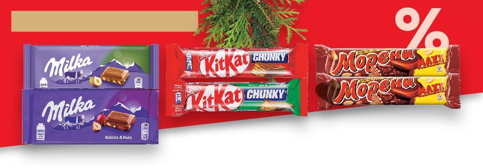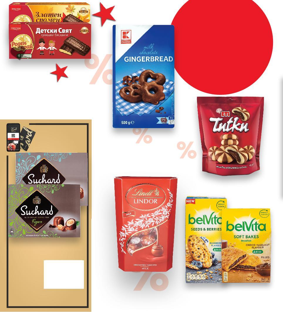 ЗАХАРНИ ИЗДЕЛИЯ Отстъпката с Kaufland Card e изчислена спрямо стандартната текуща цена, на която продуктът се предлага в хипермаркета. Цените са валидни за посочените на последна страница хипермаркети. Стоките се продават в количества, обичайни за едно домакинство. Всички цени са в лева с включен ДДС. Всички артикули се предлагат без декорация. Снимките са примерни. СПЕСТИ ДО -34% ОТ ЦЕНАТА ЗАХАРНИ L { -13% 3,29 3,79 12,99 само -34% 0,75 -25% 3,29 0,49 4,39 1,39 само 1,79 само 0,75 само -23% 3,39 4,45само само 1,99 само Меденки с млечен шоколад 500 г (1 кг = 6,58) LINDT LINDOR Шоколадови бонбони млечни или асорти 337 г (1 кг = 38,55) МОРЕНИ MAXX Тунквана вафла 49 г (1 кг = 10,00) ETI Бисквити Tutku 162 г (1 кг = 8,59) ПРЕСТИЖ РОДЕН КРАЙ Тунквани бисквити Златен спомен, Детски свят или Кафе 135 г (1 кг = 13,26) KIT KAT CHUNKY Десерт различни вкусове 40 - 42 г (1 кг = до 18,75) SUCHARD Шоколадови бонбони различни видове 126 - 153 г (1 кг = от 22,16) Цена с KAUFLAND CARD BELVITA Бисквити различни видове 250 - 270 г (1 кг = до 13,16) MILKA Шоколад избрани видове 85 - 100 г (1 кг = от 19,90) S28-BG-KW46-LFT-SUSS_L-1000-10 28