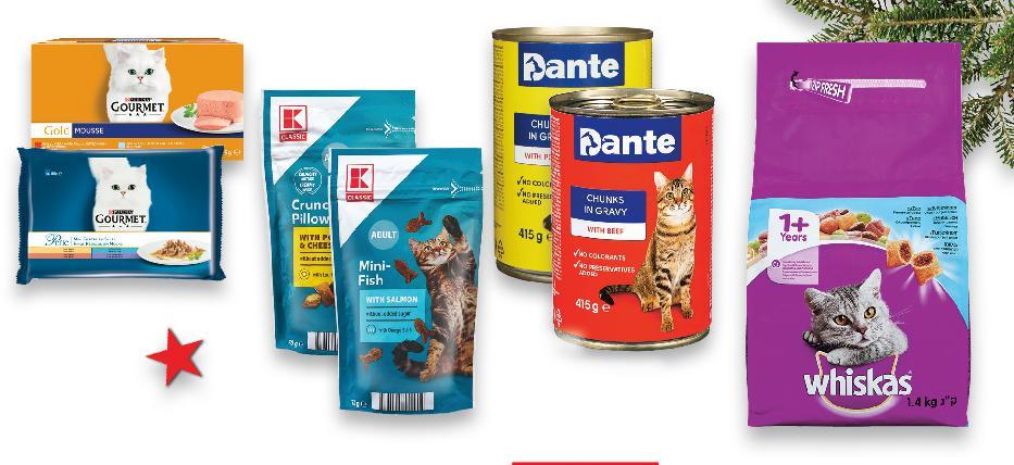 *Със звездичка са обозначени артикулите, които са специално предложение до изчерпване на наличностите. Kaufland не носи отговорност за печатни грешки. без дабавена захар и консерванти 1,35 само 3,89 само 5,99 само 3,69 само -32% 4,69 6,99 -16% 0,99 1,19 9,99* само 39,99* само 19,99* само -22% 13,49 10,49 10 кг 2 кг 1 кг 1,4 кг DANTE Храна за котки с вкус на говеждо или пиле 415 г (1 кг = 3,26) GOURMET GOLD Храна за котки различни видове микс в опаковка 4 бр. х 85 г или 6 бр. х 50 г (1 кг = от 11,45) Котешка тоалетна суперабсорбираща 10 кг (1 кг = 0,60) CK CAT Суха храна за котки микс пиле, пуйка и зеленчуци 1 кг (1 кг = 3,69) Суха храна за котки различни видове 2 кг (1 кг = 2,35) Лакомство за котки различни видове 70 г (1 кг = 14,15) Уред за почистване на котешка тоалетна бързо и лесно разделяне на чист от мръсен пясък, включена ролка торбички Катерушка за котки с място за спане и играчки, натоварване до 4 кг, 30 x 35 x 58 см Одеяло за домашни любимци 95 х 65 см WHISKAS Суха храна за котки различни видове 1,4 кг (1 кг = 7,50) без добавена захар S37-BG-KW46-LFT-TIER_R-1000-10 37