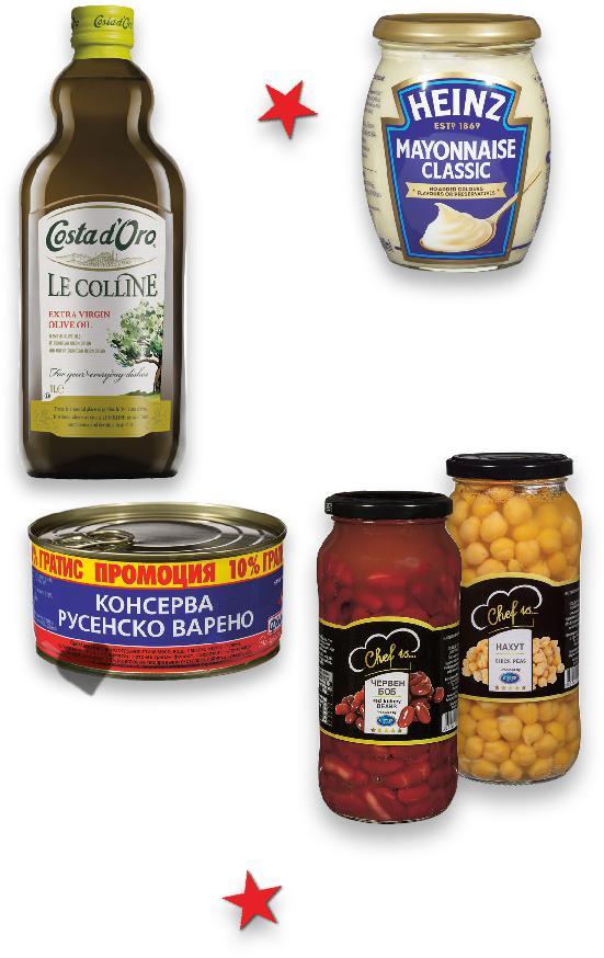Отстъпката с Kaufland Card e изчислена спрямо стандартната текуща цена, на която продуктът се предлага в хипермаркета. **При покупка над 15 бр. всеки следващ продукт се продава на стандартна цена. *Със звездичка са обозначени артикулите, които са специално предложение до изчерпване на наличностите. Kaufland не носи отговорност за печатни грешки. -25% ОТСТЪПКА ЗА ВСИЧКИ ПРОДУКТИ С МАРКА MAGGI ДО 15 БРОЯ НА ПОКУПКА** Отстъпката с Kaufland Card e изчислена спрямо -30% 3,79 5,49 11,99 само -32% 2,69 3,99 -28% 2,49 3,49 -23% 4,99 6,49 -27% 1,29 1,79 -18% 4,49 с5,49 5,49 амо само -31% 2,99 4,39само само 1 литър ОСНОВНИ ХРАНИ И КОНСЕРВИ JOTIS Микс за печене 1-2 Bake! различни видове 500 г (1 кг = 7,58) COSTA D‘ORO Маслиново масло Le Colline 1 л (1 л = 11,99) KRINA Ориз бланширан 1 кг (1 кг = 2,69) CHEF IS... Червен боб, Бял боб, Нахут или Леща 540 г (1 кг = 4,62) HEINZ Майонеза класик 480 мл (1 л = 10,40) CASA BELLA Макаронени изделия различни видове 400 г (1 кг = 3,23) КАЛИАКРА Олио първа преса 1 л (1 л = 4,49) CAMPESE Грах пресен, зелен 690 г (1 кг = 4,34) Цена с KAUFLAND CARD Цена с KAUFLAND CARD екстра върджин -5% 1,89* 1,99 ФАМИЛНА+ Русенско варено 300 г (1 кг = 6,30) S27-BG-KW46-LFT-MOPRO_R-1000-10 27