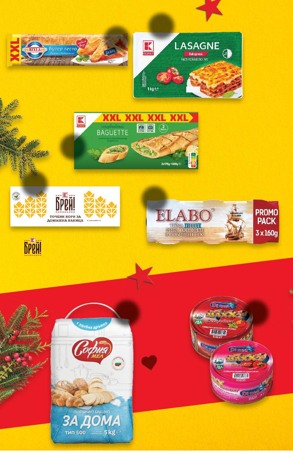 Цените са валидни за посочените на последна страница хипермаркети. Стоките се продават в количества, обичайни за едно домакинство. Всички цени са в лева с включен ДДС. Всички артикули се предлагат без декорация. Снимките са примерни. XXL ПРЕДЛОЖЕНИЯ 1 кг 1 кг 5 кг 350 грама 2x400 грама 2x160 грама 310-320 грама 6,49 само -53% 2,39 5,18 -35% 2,49 3,89 7,99* само -13% 6,49 7,49 2,29* 8,29 само само БЕЛЛА Бутертесто XXL опаковка замразено 1 кг (1 кг = 6,49) Точени кори 2 х 400 г (1 кг = 2,99) DI NEA Скумрия различни видове 310 - 320 г (1 кг = до 8,04) ELABO Риба тон филе в собствен сос или в растително масло 3 x 160 г (1 кг = 16,65) СОФИЯ МЕЛ Брашно за дома 5 кг (1 кг = 1,30) Лазаня Болонезе по класическа италианска рецепта охладена 1 кг (1 кг = 8,29) Багета с масло с билки или чеснова замразена 350 г (1 кг = 6,55) S6-BG-KW46-LFT-XXL2_L-1000-10 6