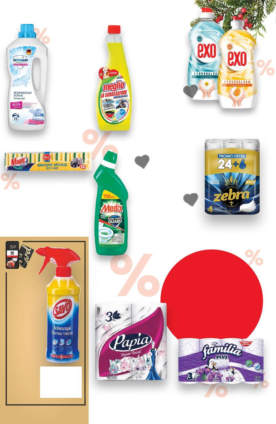 ЧИСТО ДОМАКИНСТВО Цените са валидни за посочените на последна страница хипермаркети. Стоките се продават в количества, обичайни за едно домакинство. Всички цени са в лева с включен ДДС. Всички артикули се предлагат без декорация. Снимките са примерни. СПЕСТИ ДО -50% ОТ ЦЕНАТА -26% 2,49 3,39 5,99 само -28% 17,99 24,99 -37% 4,39 6,99 -35% 2,59 3,99 4,69 -29% 7,59 10,79 само -14% 3,99 -50% 2,19 4,39 -23% 2,59 1,99 ✓ четрипластова 15 пранета 1 изпиране = 0,40 лв. MEDIX WC гел различни видове 750 мл (1 л = 3,32) HEITMANN Дезинфектант за пране срещу бактерии и гъбички 1,25 л = 15 пранета (1 л = 4,80) ZEBRA Тоалетна хартия бяла или Perfume, 24 + 6 бр. в опаковка (1 бр. = 0,60) MAGIC CLEAN Домакинска гъба с канал 10 бр. в опаковка (1 бр. = 0,26) FAMILIA Тоалетна хартия трипластова, целулозна различни видове 8 бр. в опаковка (1 бр. = 0,55) SAVO Препарат против плесен и мухъл спрей 500 мл (1 л = 15,18) Цена с KAUFLAND CARD MEGLIO Обезмаслител пълнител 750 мл (1 л = 5,32) PAPIA Кухненска ролка с мотив трипластова, целулозна 2 бр. в опаковка (1 бр. = 1,10) ПРОМОПАКЕТ EXO Препарат за съдове различни видове 400 мл (1 л = 4,98) Отстъпката с Kaufland Card e изчислена спрямо стандартната текуща цена, на която продуктът се предлага в хипермаркета. S34-BG-KW46-LFT-DRP_L-1000-10 34