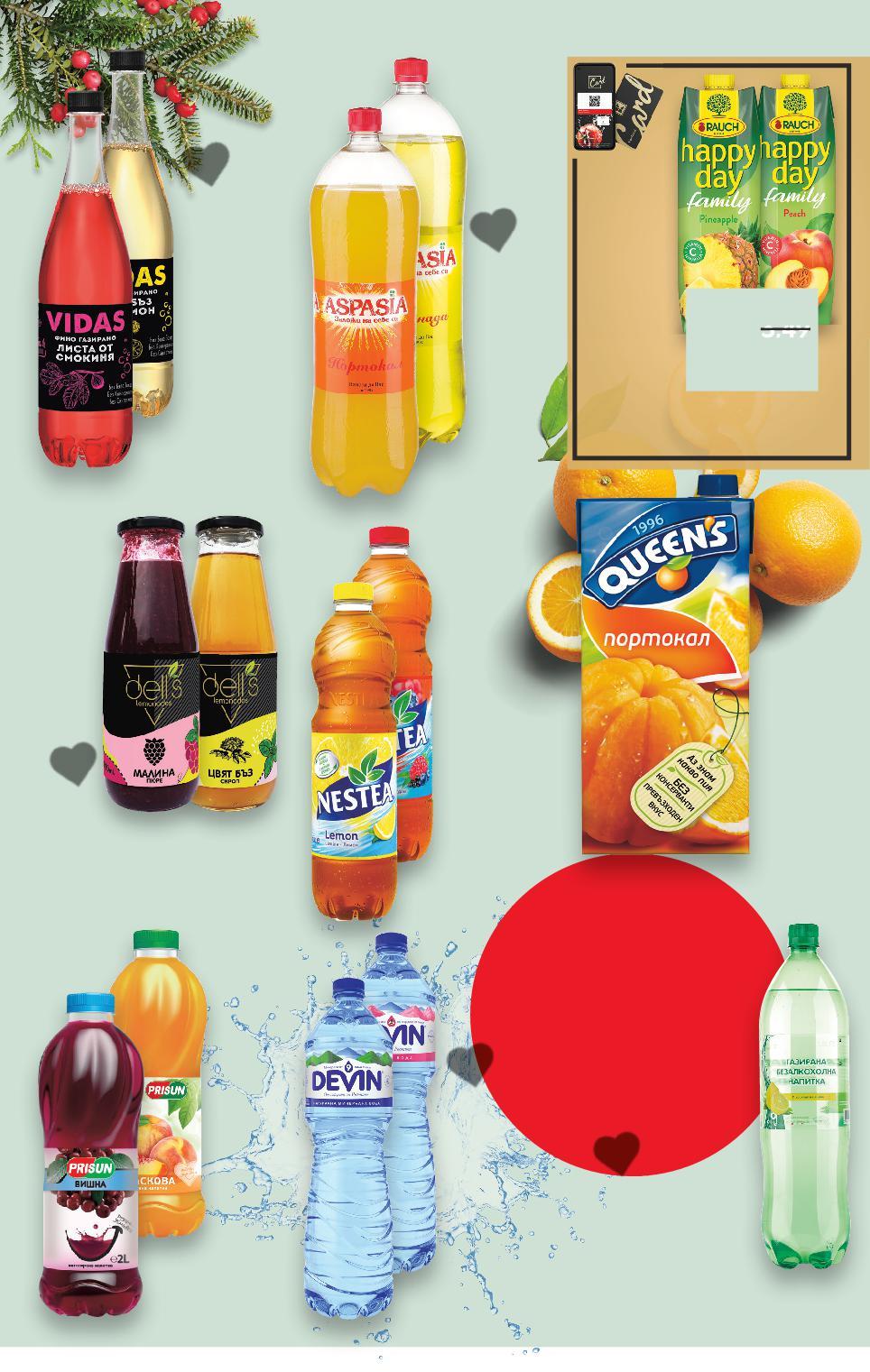 СПЕСТИ ДО -38% ОТ ЦЕНАТА -33% 2,19 3,29 -38% 2,99 4,89 -22% 2,79 3,59 -31% 0,75 1,09 -31% 0,65 0,95 1,79 само -20% 2,79 3,49 само с3,49амо -20% 8,79 10,99 2 литрa 2 литрa 0,89 само 2 литрa NESTEA Студен чай различни вкусове 1,5 л РЕТ (1 л = 1,46) QUEEN‘S Нектар портокал или праскова 2 л (1 л = 1,50) VIDAS Газирана напитка с листа от смокиня, с нар и черен кимион или с бъз с лимон 1 л (1 л = 2,79) ГОРНА БАНЯ Трапезна вода газирана или газирана с аромат на лимон 1,5 л РЕТ (1 л = 0,50) DEVIN Вода изворна или минерална 1,5 л PET (1 л = 0,44) PRISUN Плодова напитка различни видове 2 л РЕТ (1 л = 0,90) HAPPY DAY Family Праскова, Ананас, Касис 25% - 35% 1 л (1 л = 2,79) Цена с KAUFLAND CARD DELLS LEMONADES Натурален плодов сироп различни видове 0,72 л (1 л = 12,21) ASPASIA Газирана напитка различни вкусове 2 л РЕТ (1 л = 0,45) *Със звездичка са обозначени артикулите, които са специално предложение до изчерпване на наличностите. Kaufland не носи отговорност за печатни грешки. **Намаляваме между 01.10.2022 и 30.10.2022 цените на от 700 до 1000 продукта (в зависимост от размера на хипермаркета). БЕЗАЛКОХОЛНИ НАПИТКИ Отстъпката с Kaufland Card e изчислена спрямо стандартната текуща цена, на която продуктът се предлага в хипермаркета. S31-BG-KW46-LFT-GEP_R-1000-10 31