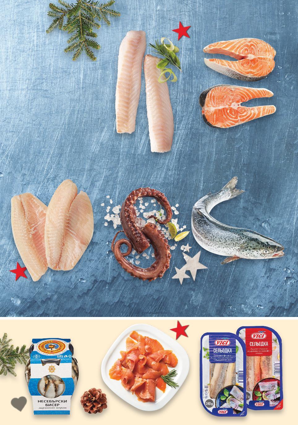 Цените са валидни за посочените на последна страница хипермаркети. Стоките се продават в количества, обичайни за едно домакинство. Всички цени са в лева с включен ДДС. Всички артикули се предлагат без декорация. Снимките са примерни. На последна страница може да видиш дали в твоя Kaufland предлагаме риба и морски деликатеси от витрина с обслужване или на самообслужване. 11,99 само -40% 17,99 29,99 само 29,99 -35% 3,89 5,99 -38% 33,99 54,99 2,29 само 13,99 само 16,99 само Хек филе Улов: див улов в Аржентина размразено кг (1 кг = 11,99) Сьомга цяла изчистена размер 1 - 3 кг прясна кг (1 кг = 17,99) Сьомга котлет Улов: аквакултури в Норвегия пресен кг (1 кг = 29,99) VICI Сельодка класик или розова 240 г (1 кг = 16,21) Сьомгoва пъстърва филенца студено-пушени кг (1 кг = 33,99) НЕСЕБЪРСКИ БИСЕР Мариновани шпроти 290 г (1 кг = 7,90) Калмари пипала Улов: див улов в Перу размразени кг (1 кг = 13,99) Тилапия филе Улов: аквакултури в Китай размразено кг (1 кг = 16,99) Улов: aквакултури от Дания и Норвегия съдържа Омега-3 мастни киселини РИБА И МОРСКИ ДЕЛИКАТЕСИ РИБНИ ДЕЛИКАТЕСИ СПЕЦИАЛНА ОПАКОВКА, ЗАПАЗВАЩА СВЕЖЕСТТА БОГАТО РАЗНООБРАЗИЕ ОТ РИБА И МОРСКИ ДАРОВЕ СВЕЖ УЛОВ ОТ БЛИЗО И ДАЛЕЧ S24-BG-KW46-LFT-FIP_L-1000-10 24