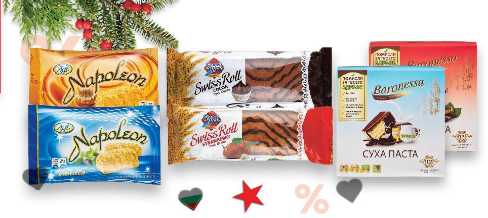 ТЕСТЕНИ ИЗДЕЛИЯ И ХЛЯБ *Със звездичка са обозначени артикулите, които са специално предложение до изчерпване на наличностите. Kaufland не носи отговорност за печатни грешки. 1,19 само 0,89 само -50% 2,49 4,99 1,64 само 0,95 само -28% 0,35 0,49 2,49* само 0,89 само -45% 1,79 с3,29 3,29 амо само БАРОНЕСА Суха паста мляко или какао 12 x 35 г 420 г (1 кг = 5,93) Кифлички с шоколад, с локум или с мармалад и мак 6 бр. в опаковка 250 г (1 кг = 6,56) MARETTI Брускети различни вкусове 70 г (1 кг = 13,58) ПРЕСТИЖ Суха паста какао или ягода 30 г (1 кг = 11,67) RICE UP Оризов чипс различни вкусове 120 г (1 кг = 20,75) Хляб Добруджа нарязан 650 г (1 кг = 1,37) АГИ Арменски сладки с локум или Курабии с орехи и канела 200 г (1 кг = 8,95) Цена с KAUFLAND CARD SWEET WAY Руло ягода или какао 200 г (1 кг = 5,95) АГИ Сладкиш Наполеон ванилия или тирамису 90 г (1 кг = 9,89) Отстъпката с Kaufland Card e изчислена спрямо стандартната текуща цена, на която продуктът се предлага в хипермаркета. S29-BG-KW46-LFT-SUSS_R-1000-10 29