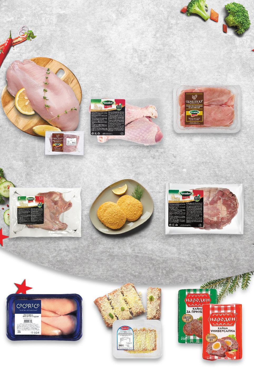 ✓автентични италиански продукти ✓чисто месо - без ГМО и антибиотици ✓ниско съдържание на мазнини Цените са валидни за посочените на последна страница хипермаркети. Стоките се продават в количества, обичайни за едно домакинство. Всички цени са в лева с включен ДДС. -20% 3,99 4,99 6,49 само 12,99 само -20% 11,99 14,99 1,65 само 5,99 само 17,49 само 5,99 6,99 само само AMADORI Кордон Бльо охладено с пуешка шунка 250 г (1 кг = 15,96) AMADORI Пуешки крила охладени вакуум опаковка кг (1 кг = 6,49) AMADORI Пуешко роле Охладено кг (1 кг = 12,99) COCO RICO Пилешко филе кг (1 кг = 11,99) НАРОДЕН Кайма охладена универсална или за принцеси с или без кашкавал 250 г (1 кг = 6,60) Месни рулца със зеленчуци 480 г (1 кг = 12,48) AMADORI Пуешко филе „Qualita 10+“ охладено кг (1 кг = 17,49) AMADORI Пуешко филе „Qualita 10+“ слайс 400 г (1 кг = 17,48) AMADORI Пуешка подбедрица вакуум опаковка кг (1 кг = 5,99) МЕСО ОТ ВИТРИНА НА САМООБСЛУЖВАНЕ СПЕЦИАЛНА СЕЛЕКЦИЯ ПУЕШКО МЕСО AMADORI за печене на фурна или като основа в ястия S22-BG-KW46-LFT-SB_L-1000-10 22