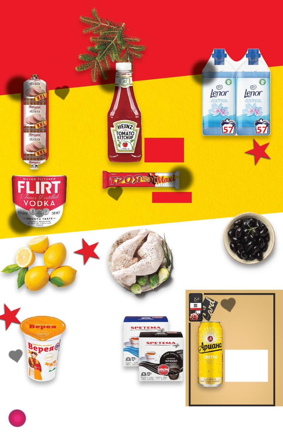 стр. 4-10 XXL РАЗМЕР ИЗГОДНО 6,99 само 3,65 само 1,89 само 6,49 само -32% 6,49 9,59 11,49 само 14,99* само -23% 1,29 1,69 -28% 0,49 0,69 4,49* само 1 кг 1 кг 28% 49 грама 1,5 литра 2 x 1,5-1,7 литра -30% 0,97 1,39 само с1,39 амо SPETEMA Кафе капсули различни видове 16 бр. в опаковка 96 - 100,8 г (1 бр. = 0,41) Черни маслини Супер, супер Мамут размер: 81/ 90 Произход: Гърция, Халкидики от нашата витрина кг (1 кг = 6,99) HEINZ Кетчуп 1 кг (1 кг = 6,49) LENOR Омекотител или Парфюмни перли омекотител: различни видове 2 x 1,5 - 1,7 л = 2 х 50 - 57 пранета перли: Spring Awakening 2 x 140 г (1 л = от 3,38) FLIRT Водка 37,5% vol 1,5 л (1 л = 10,00) Пилешко бутче с част от гърба охладено от нашата витрина кг (1 кг = 3,65) Лимони Клас: I кг (1 кг = 1,89) ВЕРЕЯ Кисело мляко 3,6% масленост по БДС 400 г (1 кг = 3,23) Престиж Троя Тунквана вафла Макси 49 г (1 кг = 10,00) МЕГДАНА Колбас Телешки, Хамбургски или Камчия 1 кг (1 кг = 4,49) ПРОМОПАКЕТ АРИАНА Бира 4,5% vol 0,5 л кен (1 л = 1,94) Цена с KAUFLAND CARD Цените са валидни от 14.11.2022 до 20.11.2022 или до изчерпване на наличностите. Стоките се продават в количества, обичайни за едно домакинство. Всички цени са в лева с включен ДДС. Цените са валидни за посочените на последна страница хипермаркети. Kaufland не носи отговорност за печатни грешки. Всички артикули се предлагат без декорация. Снимките са примерни. Предложенията може да видиш и на kaufland.bg. Повече за Моите любими марки научи на kaufland.bg/ otlichiya. *Със звездичка са обозначени артикулите, които са специално предложение до изчерпване на наличностите. Отстъпката с Kaufland Card e изчислена спрямо стандартната текуща цена, на която продуктът се предлага в хипермаркета. ОТ ПОНЕДЕЛНИК, 14.11.2022 ДО НЕДЕЛЯ, 20.11.2022 съвместими с кафе системи Dole Gusto S1-BG-KW46-LFT-TS-1000-10