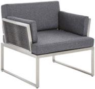 Dining-Loungeset, Gestell Aluminium pulverbeschichtet, Geflecht hellgrau, Auflagen dunkelgrau, Tisch, Platte Keramik auf Glas, ca. 200 x 100 x 74 cm, 6x Sessel, ca. 65 x 92 x 75 cm 20040019_09 2.399,Gartensessel, auch einzeln erhältlich, ca. 65 x 92 x 75 cm 20040019_01 299,-