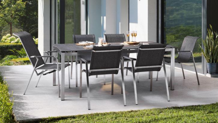 1: Garten-Set, Edelstahl gebürstet, Stapelsessel, Textilene silbergrau, Armlehnen Aluminium schwarz, ca. 54 x 89 x 61 cm, Tischplatte, HPL zementfarbig, ca. 200 x 100 x 1 cm, Tischgestell, Edelstahl silberfarbig, ca. 200 x 100 x 73 cm 02160050_21,06-07 3.192,- 2.399,-