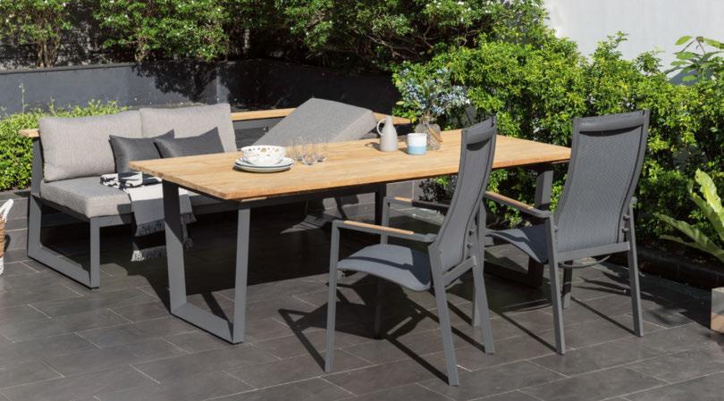 1: Gartengruppe, Gestell Aluminium anthrazit, Absetzung recyceltes Teakholz, Gartentisch, ca. 216 x 99 x 75 cm 25890046_02 999,Stapelsessel, Texteline dunkelgrau, Gestell Aluminium anthrazit, Armlehne Teakholz, ca. 63 x 108 x 65 cm 25890046_11 179,3-Sitzer-Bank, Gestell Aluminium anthrazit, Ablage Teakholz, Auflage olefin beige, inkl. Verstellung, ca. 201 x 85 x 89 cm 25890046_13 999,-