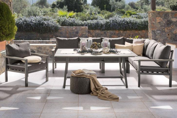 4: Dining-Loungeset, 5-teilig, Gestell Aluminium dunkelgrau pulverbeschichtet, Eckbank, Auflagen Webstoff dunkelgrau, ca. 259 x 74 x 199 cm, mit Tisch, Platte Polywood hellgrau, ca. 160 x 100 x 68 cm 07610020_19 1.499,Loungesessel, Auflagen Webstoff dunkelgrau, Armlehnen Polywood hellgrau, Gestell Aluminium dunkelgrau pulverbeschichtet, ca. 67 x 74 x 73 cm 07610020_11 249,-