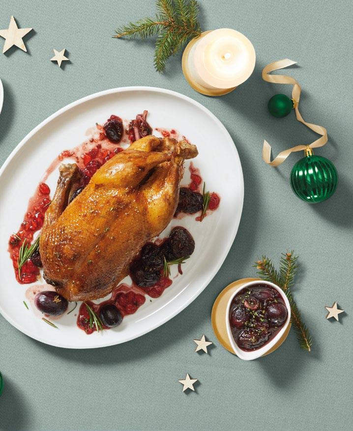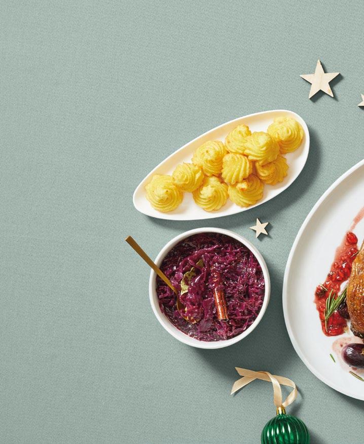 Необходими продукти: 1 цяла патица, 5 глави лук 100 ml сок от червено грозде, 1 бр. портокал, 40 ml бял винен оцет, 4 с.л. мед, 1 с.л. розмарин, 800 g червено грозде, 600 g картофени дукеси, 650 g червено зеле (1 буркан) сол, черен пипер Начин на приготвяне