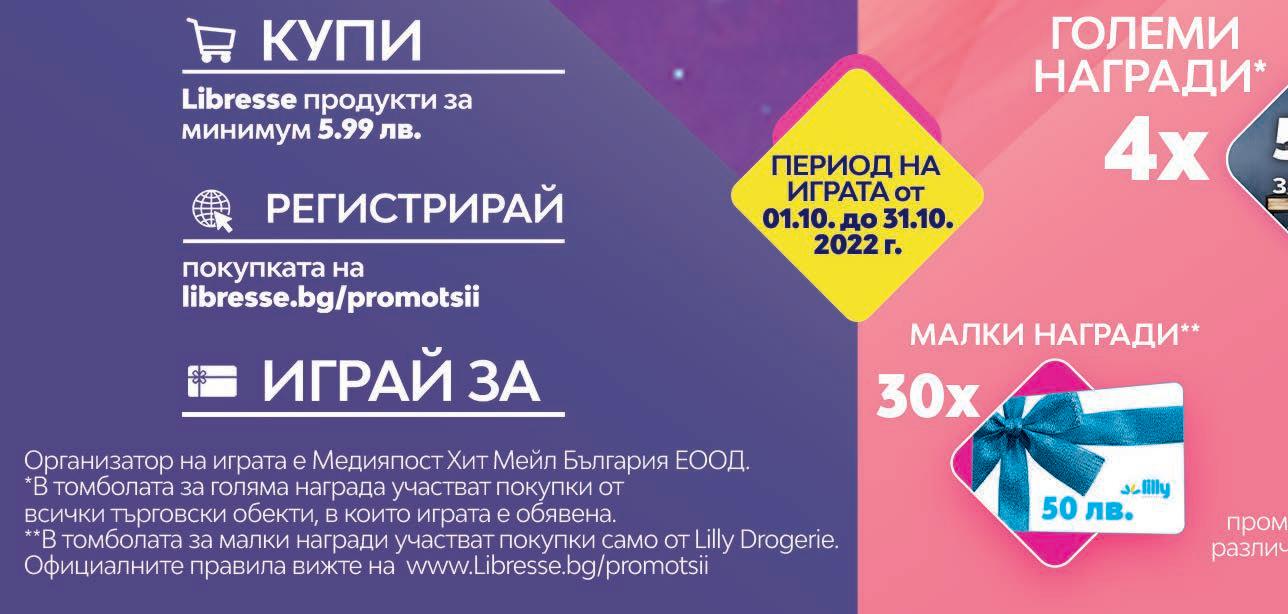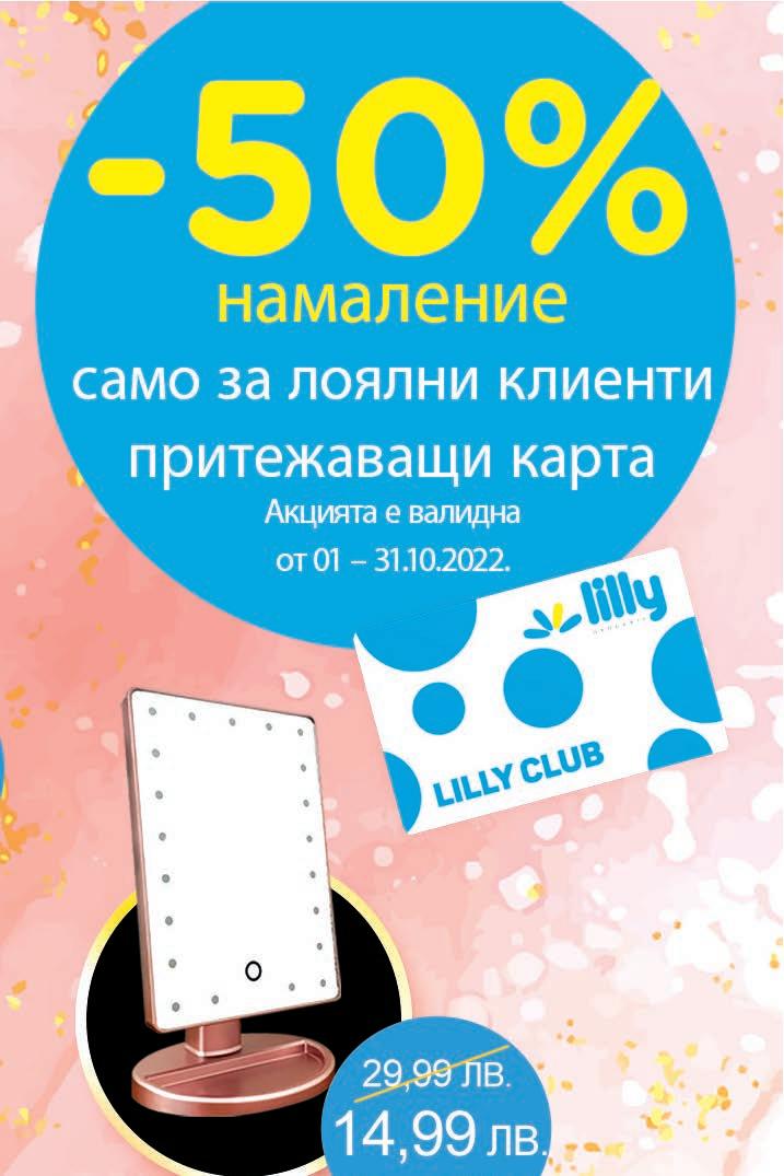 1 *Промоцията е валидна от 1.10 до 31.10.2022 или до изчерпване на количествата. *Всяко цветче ви носи 1 стотинка. Само с карта “LILLY CLUB” 20 25 20 26 10 25 21 19 Palmer’s лио за тяло с какаово масло 1 0 мл VZK MUM ат рален алсам за ри а за з рната 3 мл VZK BI IC осион за тяло 200 мл C-THRU Y BLI амска тоалетна вода 0 мл азлични аромати Soap Factory ат рален део стик мл а м и ер амот или сандалово д рво Rexona амски део спре 1 0 мл ол он 0 мл или Стик 0 мл азлични видове B.U. B LU амска тоалетна вода 0 мл азлични аромати Eveline IC L идратира лосион за тяло 00 мл азлични видове Bio-Oil лио за лице и тяло против елези и стрии 12 мл Maternea рем против стрии 1 0 мл Eveline B U Y L осион за тяло 3 0 мл азлични видове 29,49 лв. 23,39лв. 5,99 лв. 4,49лв. 5,99 лв. 4,79лв. 22,89 лв. 16,89лв. 13,19 лв. 11,75лв. 22,69 лв. 16,89лв. 25,49 лв. 19,99лв. 16,99 лв. 13,69лв. 9,79лв. 25 AQC I ILL оди мист 2 0 мл азлични аромати 14,99 лв. 11,19лв. 7,65лв. 4,29лв. 43 22 15,49 лв. 11,99лв. +25* ЦВЕТЧЕТА LILLY CLUB +25* ЦВЕТЧЕТА LILLY CLUB +90* ЦВЕТЧЕТА LILLY CLUB +60* ЦВЕТЧЕТА LILLY CLUB +20* ЦВЕТЧЕТА LILLY CLUB +90* ЦВЕТЧЕТА LILLY CLUB +60* ЦВЕТЧЕТА LILLY CLUB +50* ЦВЕТЧЕТА LILLY CLUB
