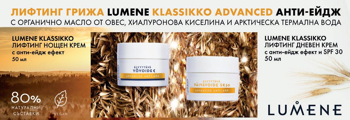 10 *Промоцията е валидна от 1.10 до 31.10.2022 или до изчерпване на количествата. *Всяко цветче ви носи 1 стотинка. Само с карта “LILLY CLUB” Nivea C LLUL LU I U Сер м сре пи ментни петна 30 мл 37,59лв. 35 48 Momo Puri ел крем за лице с прасковен серамид 0 мл L’Oreal I LI L рем за лице 0 мл Neutrogena C LLUL B невен или но ен крем против р чки 0 мл Yves Rocher I I C ILL рем за лице за с а ко а с ла ка 0 мл Holika Holika C онер за лице 1 0 мл м лсия за лице 130 мл 48,99 лв. 31,79лв. 24,79лв. 38,69 лв. 19,99лв. 19,99лв. 28,79лв. Купи продукти NIVEA на стойност минимум 15 лв. и участвай в томбола за Philips сешоар с технология SenseIQ BHD827/00 или комплект с продукти NIVEA Период на промо играта: 01.10.-31.10.2022 г. В промо играта има право да участва всяко дееспособно физическо лице, което има навършени 18 години. Организатор на промо играта е „Байерсдорф България“ ЕООД. Наградите са илюстративни и могат да се различават от реалните. Пълни правила на промо играта може да намерите на www.nivea.bg/lillyumbrella. Cellular Expert Lift Дневен или нощен крем, 50 ml Мицеларна вода, 400 ml, разл. видове NIVEA крем, 250 ml Дезодорант рол-он или спрей, 50/150 ml, разл. видове 5x x10 23,99лв. 5,69лв. 9,99 лв. 8,49лв. 7,95 лв. 4,55лв. 15 42 +180* ЦВЕТЧЕТА LILLY CLUB +10* ЦВЕТЧЕТА LILLY CLUB +150* ЦВЕТЧЕТА LILLY CLUB
