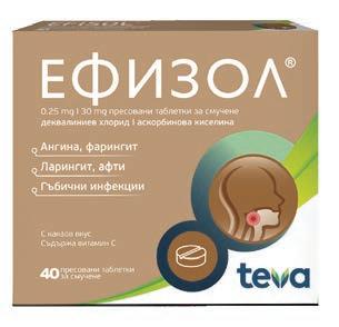 Ефизол пресовани таблетки за смучене х 40 Парацетамакс Експрес 500 mg филмирани таблетки х 20 Тройно действие при възпалено гърло Лекарствен продукт без лекарско предписание. За възрастни и деца над четири години. Преди употреба прочетете листовката. А0004/13.01.2022 1. Антисептично 2. Антибактериално 3. Противогъбично + Витамин C + Какаов вкус Бърз ефект при температура и болка По-бързо действие в сравнение със стандартна таблетка парацетамол Лекарствен продукт без лекарско предписание. Съдържа парацетамол. За възрастни, юноши и деца над 6 години. Преди употреба прочетете листовката. А0200/10.10.2022