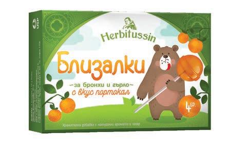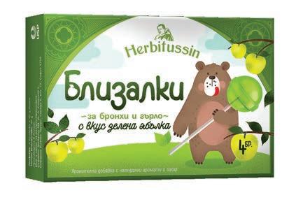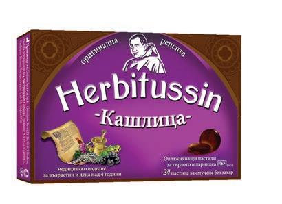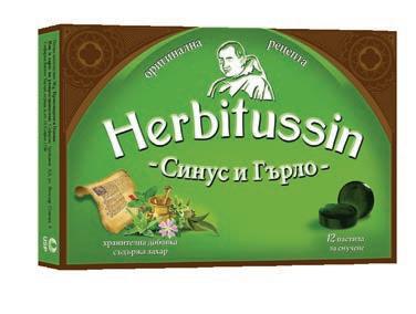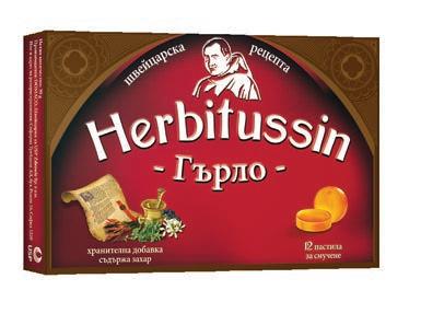 Фармацевтите на Ви препоръчват Лекарствен продукт без лекарско предписание Herbitussin Близалки, 4 бр. Билкови близалки за бронхи и гърло с вкус малина / портокал / зелена ябълка Herbitussin Близалки съдържат букет от билки, витамин С и концентрат от плодов сок. Лечебната ружа допринася за облекчаване дразненето в устната кухина, гърлото и фаринкса, а витамин С спомага за нормалното функциониране на имунната системата. Хербитусин, 12 или 24 пастили за смучене Природата на твоя страна! Билкови пастили по оригинална швейцарска рецепта с растителни екстракти и етерични масла.