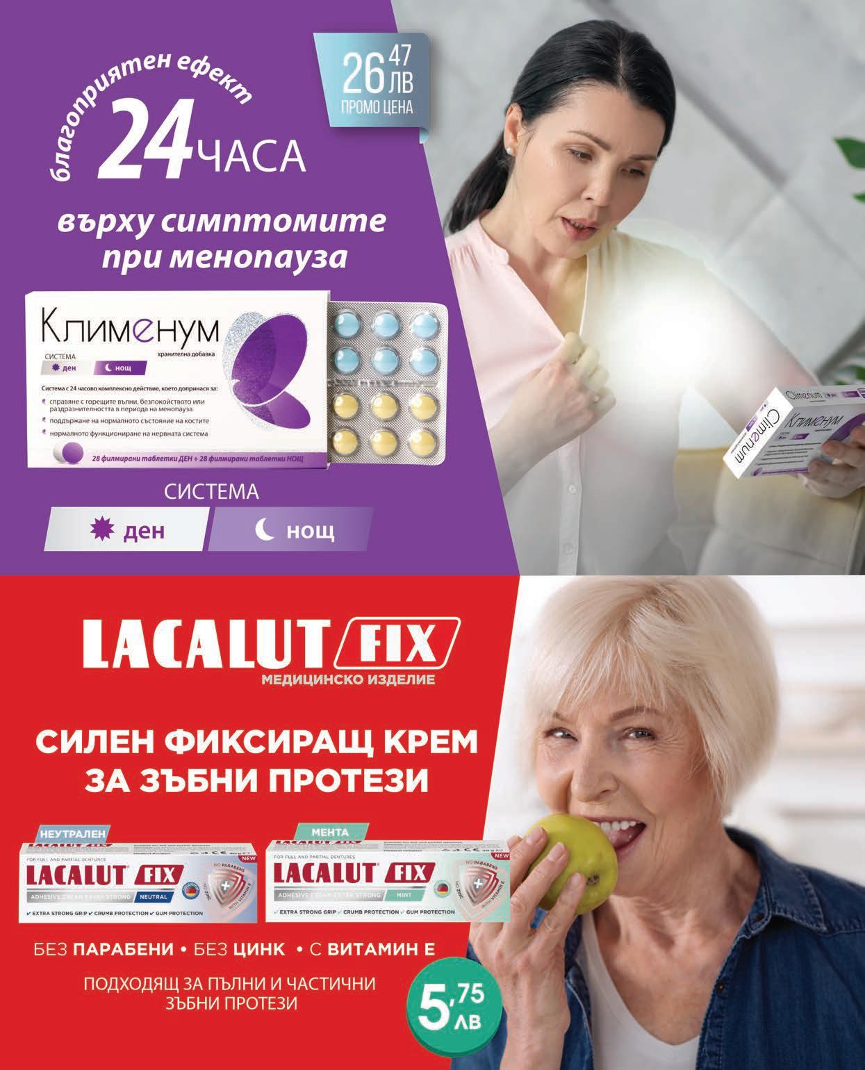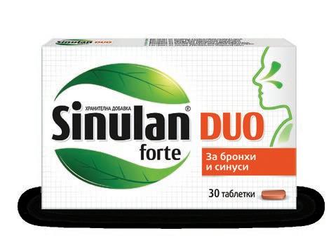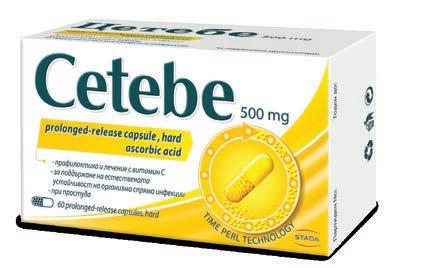 Фармацевтите на Ви препоръчват Лекарствен продукт без лекарско предписание ЦЕТЕБЕ капсули * 60 ЦЕТЕБЕ Тройна защита капсули * 60 Лекарствен продукт без лекарско предписание за възрастни и деца от 6г. А0260 /28.10.2021 Витамин С, витамин D и цинк - тройна защита за имунната система. Хранителна добавка Пълно усвояване на Витамин С – 98,6% бионаличност в организма Удължено освобождаване на Витамин С в продължение на 19 часа Удобен прием по 1-2 капсули на ден Синулан Форте Синулан Дуо Форте амо 2 таблетки дневно Подпомагат дишането Подкрепят имунитета Sinulan® дишай спокойно! За чисти синуси и отпушен нос. Хранителна добавка, от 6 годишна възраст. За чисти бронхи и отпушен нос. Хранителна добавка, от 6 годишна възраст.