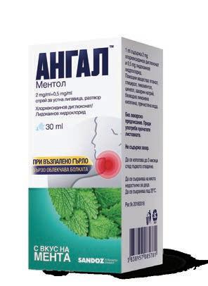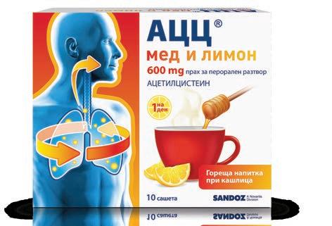 Януари Лекарствен продукт без лекарско предписание За втечняване на секрета и улесняване на отхрачването в случаи на бронхит, дължащ се на настинка. АЦЦ Мед и Лимон АЦЦ Сироп При кашлица АЦЦ 600 мед и лимон е лекарствен продукт за възрастни и юноши над 14 год. Съдържа ацетилцистеин. Преди употреба, прочетете листовката. АЦЦ Сироп е лекарствен продукт за възрастни и деца над 2 год. Съдържа ацетилцистеин. Преди употреба, прочетете листовката. Гореща напитка при кашлица Ангал Ментол таблетки за смучене Ангал Лимон таблетки за смучене При възпалено гърло. Бързо облекчава болката. Антисептично и обезболяващо действие. Ангал Ментол Спрей
