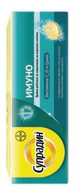 Имуно, 10 ефервесцентни таблетки с вкус на портокал Тройно действие за подсилване на имунната система! Витамин C, Витамин D и Цинк При настинка и грип за засилване на имунитета Висока доза витамин C, D и цинк за подсилване на имунитета Специално формулирани мултивитавини за подкрепа на имунната система и намаляване на периода за възстановяване Подходящи за възрастни и деца над 12 години Супрадин® Имуно ефервесцентни таблетки. Хранителна добавка с подсладители. За повече информация: Байер България ЕООД, ул. Резбарска 5, 1510 София, България, тел: +359 2 4247 280 CH-20220816-60