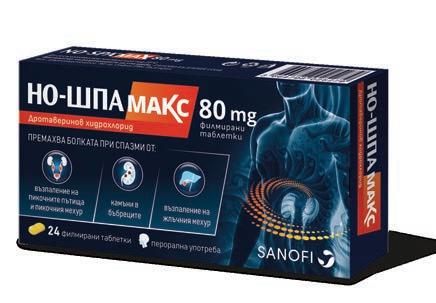 Фармацевтите на Ви препоръчват Лекарствен продукт без лекарско предписание Но-шпа МАКС 80 mg 24 филмирани таблетки Максимум сила* при болка в корема и бъбреците Премахва болката при спазми от: Възпаление на пикочните пътища и пикочния мехур Камъни в бъбреците Възпаление на жлъчния мехур Лекарствен продукт без лекарско предписание за възрастни и лица над 12 години. Преди употреба прочетете листовката. А0007/12.12.2019г. *Спрямо Но-Шпа 40mg. Но-Шпа 40 mg 24 таблетки Действа бързо при болка в корема* Премахва спазмите Ефективно