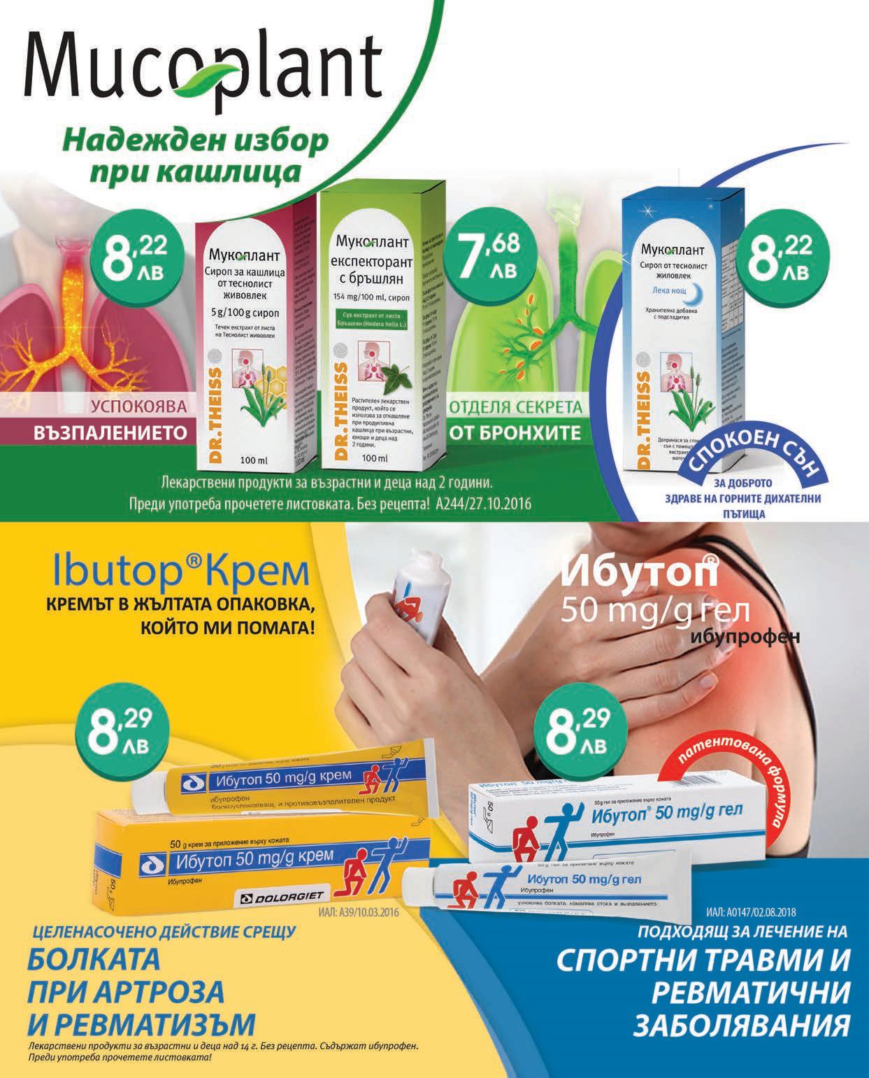 Януари Лекарствен продукт без лекарско предписание Бестарен табл. 25 мг х 10 Бронховитал Макс сироп 200 ml Бронховитал Кидс Универсал сироп 100 ml Бронховитал Кидс Имуно сироп 100 ml Пчелен прашец с Пробиотик 60 бр капсули Бързо облекчава болката В г ърба В кръста Ставите За силен имунитет и пречистване Подпомага самоочистващата функция на дихателните пътища За чис ти бронхи и ефективен имунен отговор За деца над 1 година Подпомага самоочистващата функция на дихателните пътища Улеснява отхрачването За с уха и влажна кашлица За възрастни и деца над 12 години За уши, нос и г ърло Подкрепя естествените пречистващи функции на лигавиците на дихателните пътища – на носа, гърлото, трахеята и бронхите За деца над 1 година 200 Милиарда CFU Хранителна добавка Бленд с Пчелен Прашец и