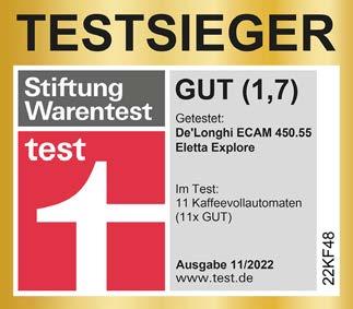 Kaffeemaschine CM 2204 Glaskanne mit 1,5 Timerfunktion Gehäuse mit Edelstahl-Applikationen 3499* (41,64) Kaffeemaschine CM8720D 2 Thermoskannen mit je 1 Liter, für bis zu 10 Tassen Antitropffunktion 4499* (53,54) Kaffeemaschine CM9021 Thermoskanne mit 1,25 Timerfunktion 2 Brühstärkeneinstellungen (normal oder stark) 4499* (53,54) Milchaufschäumer MK 559 Für 300 ml Inhalt Warme und kalte Milch aufschäumen 2499* (29,74) KapselKaffeeautomat INISSIA EN80B • 19 bar Hochdruckpumpe • Programmierbare Tassenfüllmenge • In 25 sek betriebsbereit statt bisher € 35,69 550 W Leistung nur UVP** € 111,00 nur TOP-HIT 5999* (71,39) 8,39* (9,98) Wasserfilter DLSC002 Für alle Delonghi ECAMKaffeevollautomaten 9,99* (11,89) Entkalker ECODECALK 500 ml Kaffeevollautomat ECAM 290.81 TB • 6 vorinstallierte Rezepte Espresso, Kaffee Doppio +, Long, Cappuccino, Latte Macchiato • Individuelle Einstellung von Aroma (5 Stufen) und Kaffeemenge für alle Getränke • Kegelmahlwerk mit einstellbarem Mahlgrad (13 Stufen) • 1,8 Wassertank, 250 g Bohnenbehälter • Automatisches Reinigungsund Entkalkungsprogramm UVP** € 590,00 nur TOP-HIT 32999* (392,69) Kaffeevollautomat ECAM 450.55S • Heiße oder erfrischende Kaffeespezialitäten auf Knopfdruck • Latte Crema und Latte Crema Cool Milchschaumsystem für die Zubereitung von heißem oder kaltem Milchschaum • Farbiges 3,5 „ TFT Touch Display • 40 vorinstallierte Rezepte u.a. ToGoRezepte (für bis 475 ml Travel Mugs) • Automatisches Reinigungsund Entkalkungsprogramm UVP** € 1049,00 nur TOP-HIT 67999* (809,19) Die Online Verkaufspreise können abweichen. ** Ihr möglicher Wiederverkaufspreis = unverbindliche Preisempfehlung des Herstellers nur statt bisher € 59,49 nur 6 Gültig vom 23.03. - 05.04.2023 Kaffeevollautomat CI Touch F630-101 10 Kaffeevariationen per OneTouch wählbar am TFT Touch-Farb-Display 2-Tassen-Bezug auch bei Milchspezialitäten Zweikammer-Bohnenbehälter für die Nutzung zweier Bohnensorten z.B. Espresso und Cafe Crema My Coffee Memory Funktion für bis zu 4 Personen Automatisches Reinigungs-, Entkalkungs- und Spülprogramm UVP** € 891,00 nur TOP-HIT 45000* (535,50) Kapsel-Kaffeeautomat Citiz & Milk EN267.BAE 19 bar Hochdruckpumpe Mit Milchaufschäumer zur Zubereitung von warmem oder kaltem Milchschaum oder warmer Milch Programmierbare Tassenfüllmenge UVP** € 285,00 nur TOP-HIT 11999* (142,79) Spezial-Entkalker swiss espresso Für alle gängigen Kaffeevollautomaten, Kapsel- und Padkaffeeautomaten sowie Siebträger 2 x 125 ml (je 1 Entkalkungszyklus) 649* (7,72) Eierkocher EB 2010 Für bis zu 7 Eier 1499* (17,84) Kaffeemaschine M 170 M mit Glaskanne Ca. 125 Tassen/Std. Warmhaltekapazität 2 x 1,8 l Dazu erhältlich: Ersatz-Glaskanne 1,8 24,99* (29,74) 16999* (202,29) Toaster 5KMT221 4 Zusatzfunktionen: Bagel - AuftauenAufwärmen - Warmhalten Bräunungsregler, 7 Stufen 6499* (77,34) ** Ihr möglicher Wiederverkaufspreis = unverbindliche Preisempfehlung des Herstellers statt bisher € 26,17 nur UVP** € 374,85 2025 W Leistung nur 1100 W Leistung je Restposten, nur solange der Vorrat reicht Kaffeevollautomat E-950-103 Double Cup Mode: mit nur einem Knopfdruck 2 Tassen Kaffee oder 2 Espressi gleichzeitig Mahlwerk dreistufig einstellbar Optimale Vorbrühung für beste Kaffee-Ergebnisse Automatisches Reinigungs,Entkalkungs- und Spülprogramm Gehäuse schwarz, Front silber UVP** € 419,00 nur TOP-HIT 19999* (237,99) Die Online Verkaufspreise können abweichen. UVP** € 149,00 Restposten, nur solange der Vorrat reicht 7 Gültig vom 23.03. - 05.04.2023