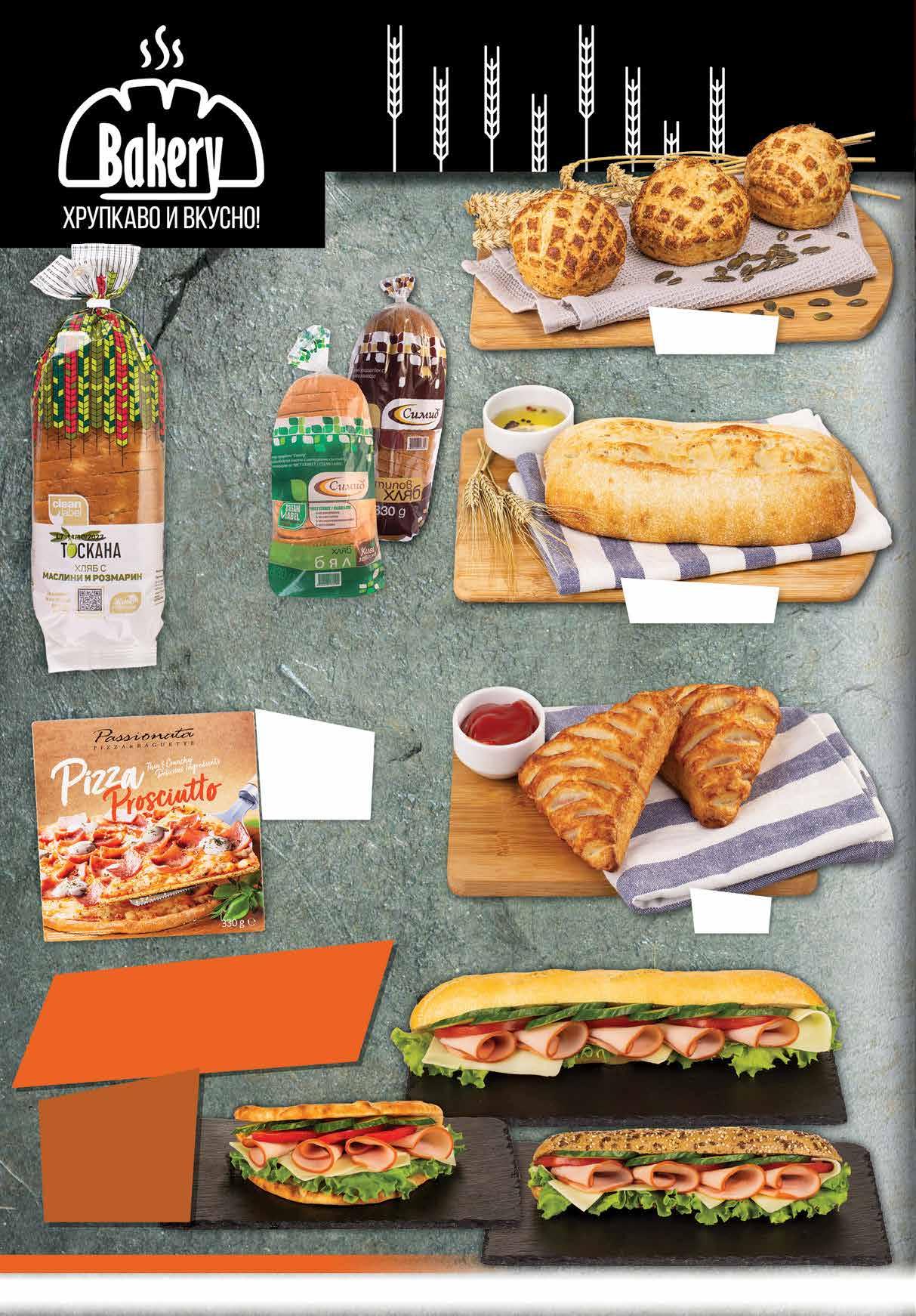 2.59 -34% 1 69 лв|бр 0.99 -30% 0 69 лв|бр 1.99 -20% 1 59 лв|бр 1.19 -25% 0 89 лв|бр 6.99 -28% 4 99 лв|бр 2.59 -46% 1 39 лв|бр Хляб с маслини и розмарин Тоскана СИМИД 500 г Хляб типов; бял СИМИД нарязан 830 г Хлебче с тиквени семки и моркови 90 г Селска чабата на каменна пещ 310 г Пица 65 г Вземи сандвич с пилешко филе с отстъпка -20% *предложението е валидно за магазините със сини цени Пица PASSIONATA замразена различни видове 310-335 г 10 Продуктите се продават в количества, обичайни за едно домакинство. Декорацията към продуктите не е включена в тяхната цена. ТВ „Фантастико“ си запазва правото на промяна в цените.