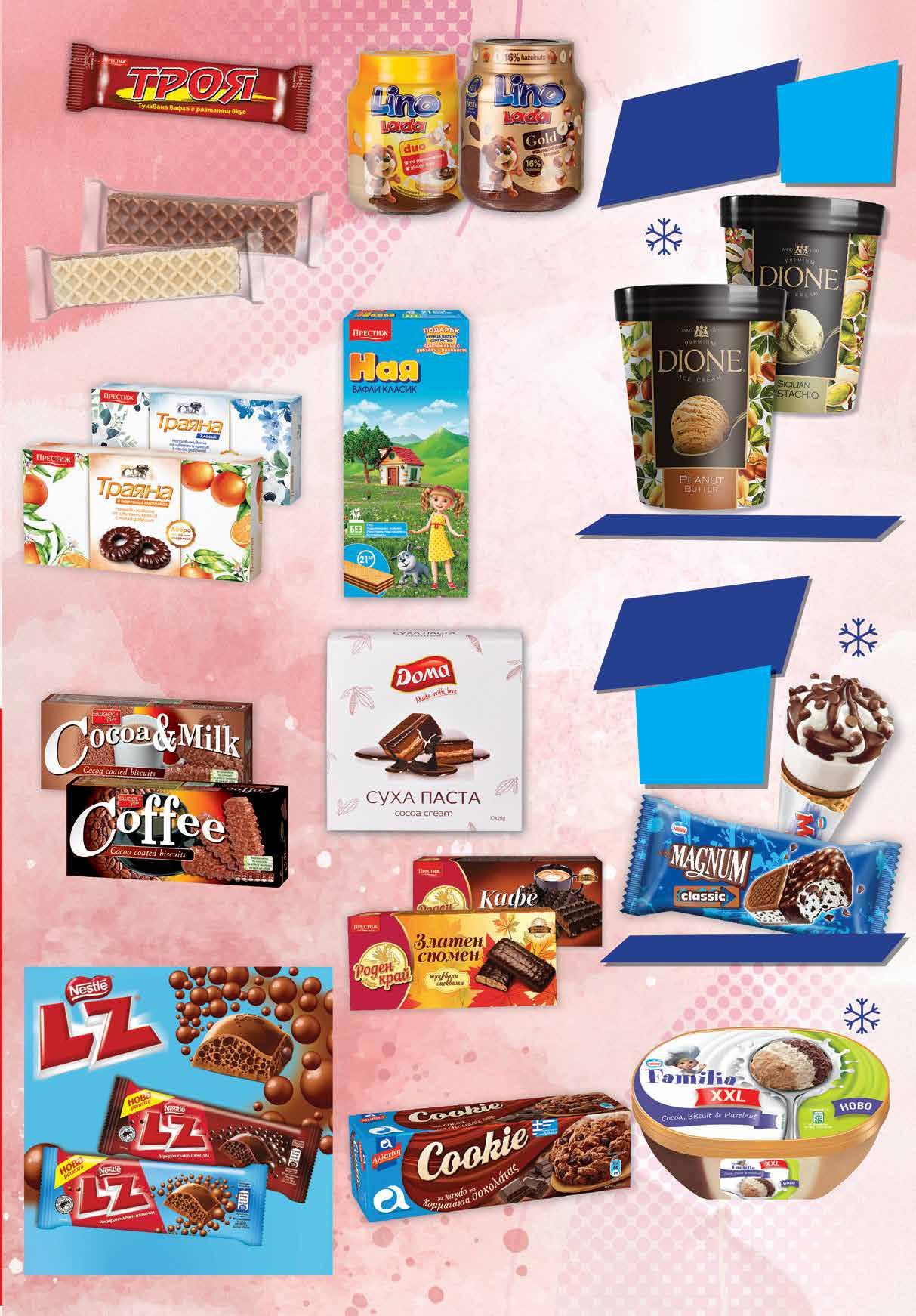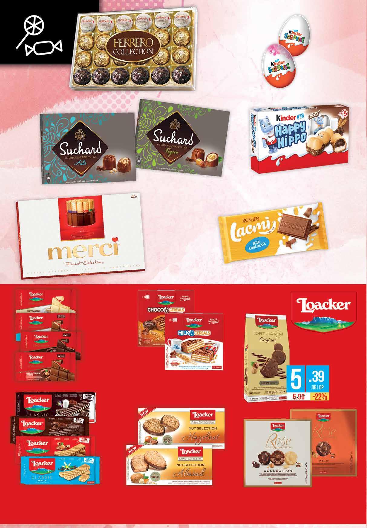 4.99 -30% 3 49 лв|бр 3.89 -23% 2 99 лв|бр 5.39 -20% 4 29 лв|бр 11.99 -25% 8 99 лв|бр 99 лв|бр 21.99 -27% 15 4.69 -25% 3 49 лв|бр 2.19 -31% 1 49 лв|бр 99 лв|бр 17.79 -26% 12 2.99 -20% 2 39 лв|бр 2.99 -20% 2 39 лв|бр 2.09 -28% 1 49 лв|бр Бонбони SUCHARD различни видове 126 -153 г Десерт KINDER Happy Hippo 103 г Шоколад ROSHEN Lacmi различни видове 90 г Бонбони MERCI 400 г Бонбони FERRERO Колекция 269.4 г Шоколадово яйце KINDER Surprise Lei; Uni 20 г Вафли LOACKER Cereals различни видове 100 г Шоколад LOACKER различни видове 85-87 г Вафли LOACKER различни видове 118 г; 175 г Бисквити LOACKER различни видове 100 г Вафли LOACKER Тоrtina mini 90г Бонбони LOACKER ROSE различни видове 150 г 14 Продуктите се продават в количества, обичайни за едно домакинство. Декорацията към продуктите не е включена в тяхната цена. ТВ „Фантастико“ си запазва правото на промяна в цените.