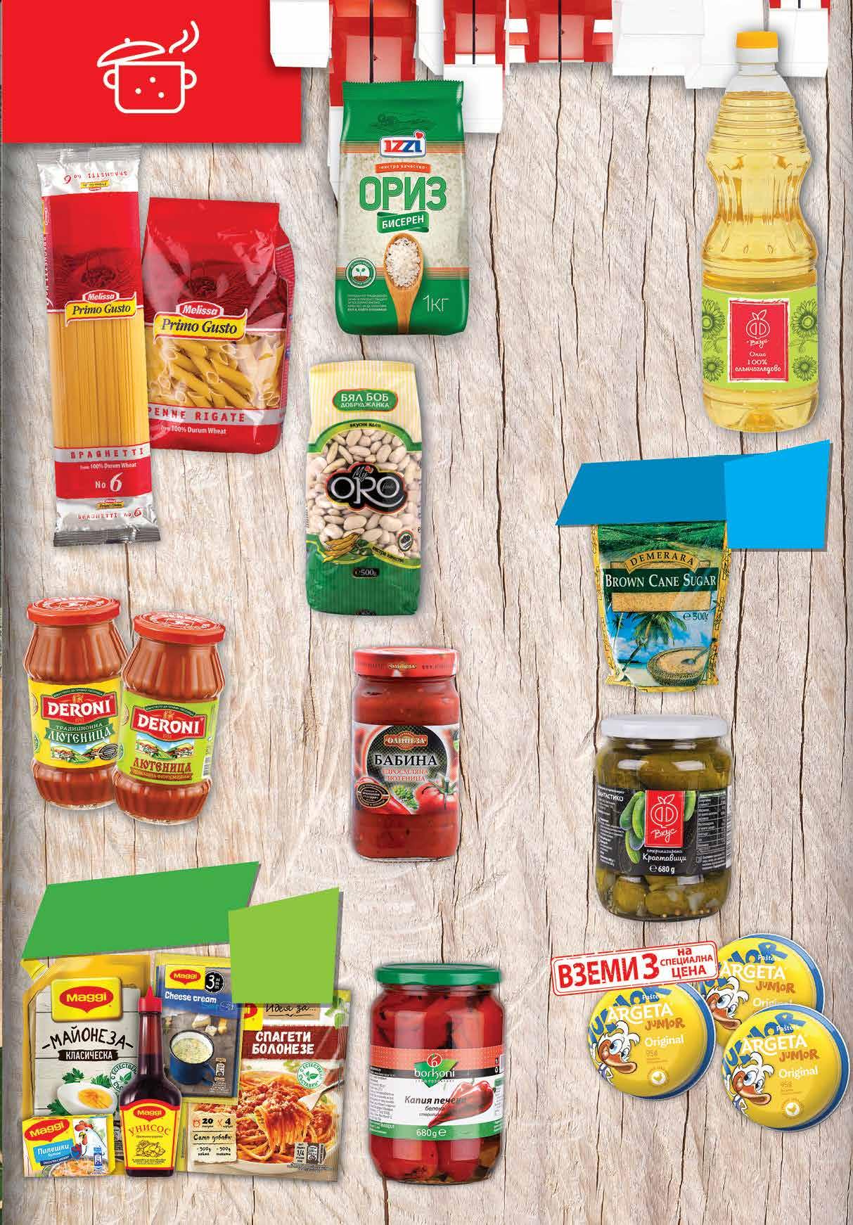 4.79 -16% 3 99 лв|бр 6.39 -28% 4 59 лв|бр 4.59 -28% 3 29 лв|бр 8.97 -44% 4 99 лв|3 бр 4.99 -22% 3 85 лв|бр 3.39 -20% 2 69 лв|бр отстъпка -30%Всички продукти с марка MAGGI с *предложението е валидно за магазините със сини цени 2.49 -20% 1 99 лв|бр 4.39 -25% 3 29 лв|бр 3.29 -27% 2 39 лв|бр Печена белена капия BORKONI 680 г Ориз Бисерен IZZI Екстра Качество 1 кг Лютеница финосмляна DERONI Традиционна 520 г; Домашна 525 г Краставички стерилизирани Ф ВКУС 680 г Пастет ARGETA Пилешки; Пилешки Джуниър 3* бр х 95 г *от един и същи вид Макарони Пене; Фусили; Звездички; Кус-кус Спагети №6; №7; №10; MELISSA 500 г 3 бр х 2,99 = Бял боб Добруджанка MY ORO 500 г *предложението е валидно за магазините със сини цени Едросмляна лютеница ОЛИНЕЗА Бабина буркан, 515 г *Слънчогледово олио Ф ВКУС 1 л *ограничение до 12 бр на клиент -20%Всички видове кафява захар с марка DEMERARA с отстъпка 9ТВ „Фантастико” не носи отговорност за допуснати печатни грешки. Количествата са лимитирани! Предложенията са валидни до сряда 22.00ч. на 19.10.2022 г.
