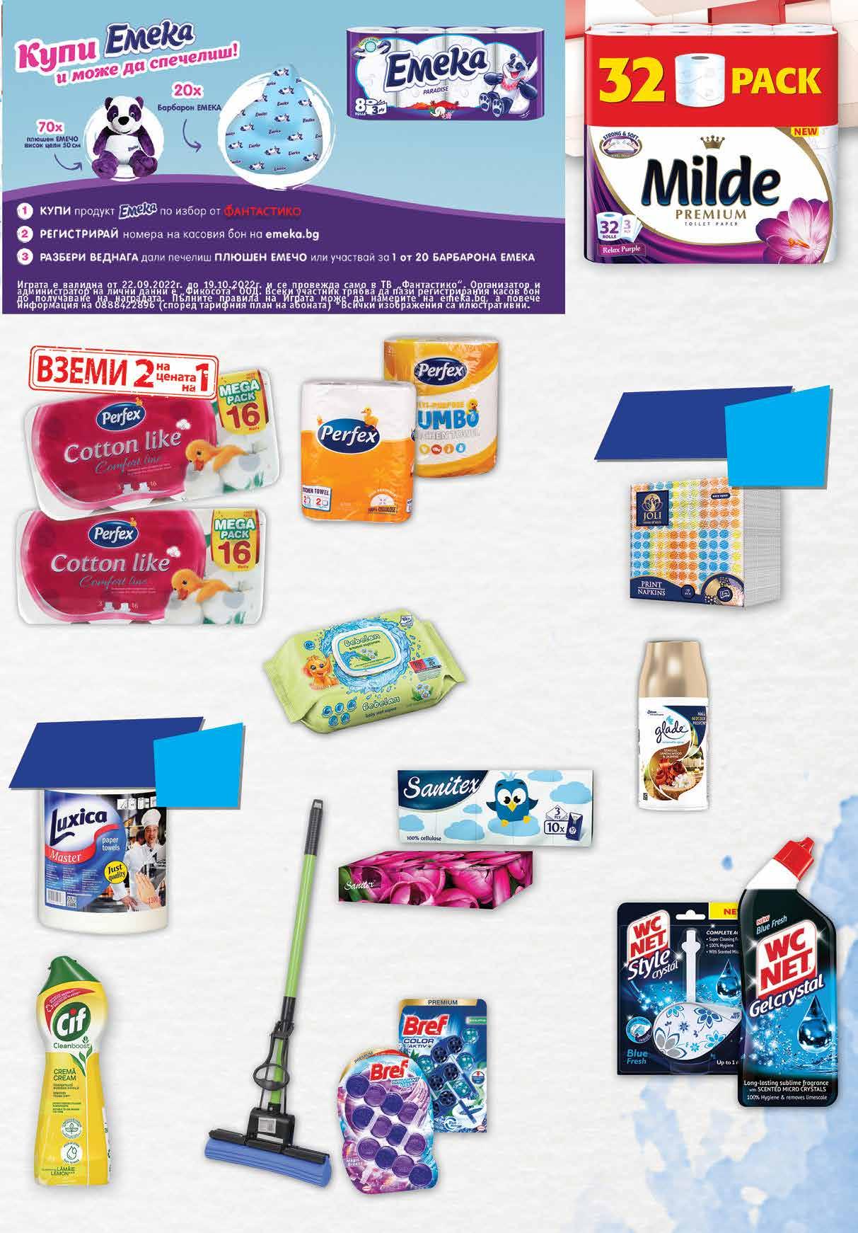 3.45 -27% 2 49 лв|бр 7.79 -35% 4 99 лв|бр 6 49 лв|к-т 4.49 -46% 2 39 лв|бр гел 3.69 -40% 2 19 лв|бр 3.25 -38% 1 99 лв|бр Jumbo 2.49 -40% 1 49 лв|бр Boni 99 лв|бр 41.99 -45% 22 14.99 -46% 7 99 лв|бр 58 лв|2 бр 33.16 -50% 16 9.99 -30% 6 99 лв|бр 2.35 -19% 1 89 лв|бр носни 2.55 -25% 1 89 лв|бр лице 4 69 лв|бр Тоалетна хартия MILDE Premium Relax Purple трипластова, ароматизирана 32 бр в опаковка Тоалетна хартия EMEKA трипластова, 8 бр, различни видове Всички Кухненски рула LUXICA с Кухненско руло PERFEX двупластово Jumbo 1 бр; Boni 2 бр в опаковка Тоалетна хартия PERFEX Cotton Like 2 оп. х 16 бр в опаковка отстъпка Минимум -25% Всички салфетки с марка JOLI с отстъпка *предложението е валидно за магазините със зелени цени минимум МЕДЖИК МОП единичен изстискващ механизъм 115 см -25% Комплект ароматизатор за WC BREF Color Aktiv; Switch Perfume; Deluxе; 3 бр х 50 г Brilliant 3 бр х 42 г различни видове *Цената в валидна от 13.10 до 19.10.2022г. Кърпи за лице двупластови 100 бр в кутия Носни кърпи трипластови 10х10 бр в пакет SANITEX различни видове Пълнител за ароматизатор GLADE Аутоматик различни видове 269 мл Бебешки кърпи BEBELAN различни видове 80 бр с капак Ароматизатор 36.5 г Препарат 750 мл различни видове WC NET CRYSTAL Препарат CIF CREAM различни видове 700 мл 23ТВ „Фантастико” не носи отговорност за допуснати печатни грешки. Количествата са лимитирани! Предложенията са валидни до сряда 22.00ч. на 19.10.2022 г.