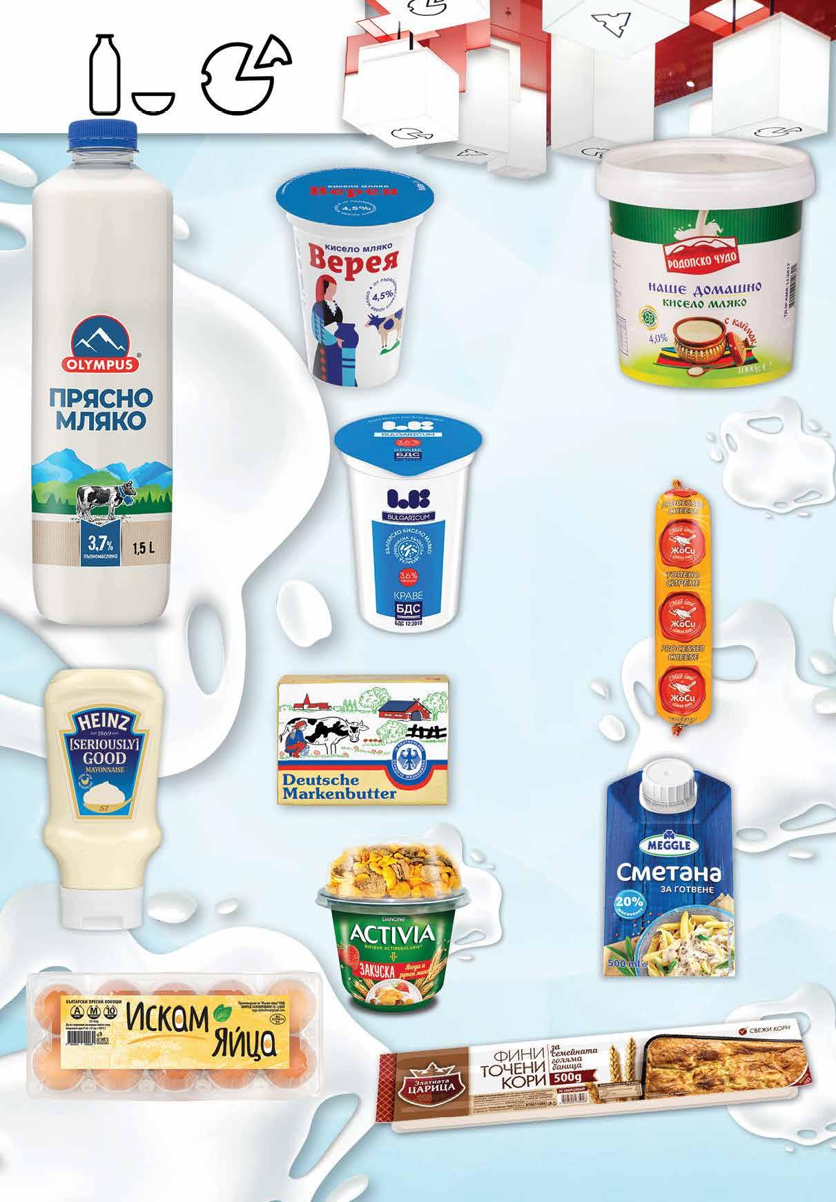 1.69 -26% 1 25 лв|бр 9.69 -41% 5 69 лв|бр 5.99 -25% 4 49 лв|бр 3.69 -27% 2 69 лв|бр 5.29 -20% 4 19 лв|бр 4.59 -26% 3 39 лв|бр 6.69 -25% 4 99 лв|бр 5.99 -21% 4 69 лв|бр 3.99 -25% 2 99 лв|бр 1.65 -21% 1 29 лв|бр 1.99 -20% 1 59 лв|бр Фини точени кори 500 г ЗЛАТНАТА ЦАРИЦА Краве масло DEUTSCHE MARKENBUTTER 250 г Кисело мляко с каймак РОДОПСКО ЧУДО масленост 4% 1 кг Топено сирене ЖОСИ 200 г Кисело мляко ЕЛ БИ масленост 3,6% по БДС 400 г Прясно мляко OLYMPUS масленост 3,7% 1,5 л Яйца ИСКАМ ЯЙЦА размер M, 10 бр в опаковка Млечна сметана MEGGLE за готвене масленост 20% 500 мл Майонеза HEINZ Classic 395 г ACTIVIA Закуска различни видове 198 г Кисело мляко ВЕРЕЯ масленост 4,5% 400 г 4 Продуктите се продават в количества, обичайни за едно домакинство. Декорацията към продуктите не е включена в тяхната цена. ТВ „Фантастико“ си запазва правото на промяна в цените.