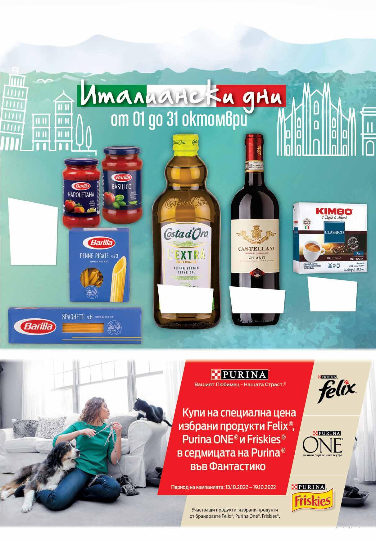 15.98 -43% 8 99 лв|к-т 99 лв|бр 23.99 -50% 11 4.79 -37% 2 99 лв|бр сос 3.49 -37% 2 19 лв|бр 99 лв|бр 13.99 -21% 10 Комплект кафе KIMBO CLASSICO 2 бр х 250 г мляно, вакуум Маслиново масло Екстра Върджин COSTA d‘ORO 1 л Спагети №3; 5 Макарони Пене Ригате №73; Фусили №98 500 г Сос с босилек; Наполитана 400 г BARILLA Вино Chianti CASTELLANI произход Италия 750 мл fantastico.stores www.fantastico.bgОФЕРТА ЗА ПЕРИОДА от 13 .10.2022 г. до 22.00 ч . на 19.10.2022 г.