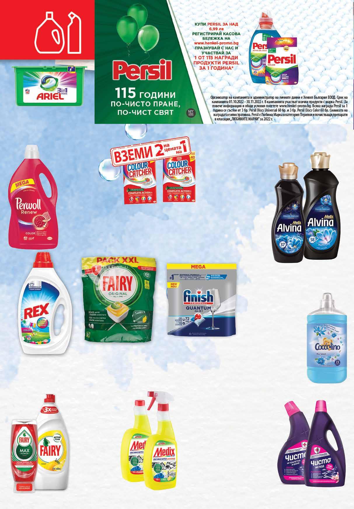 7.29 -31% 4 99 лв|бр 4.59 -26% 3 39 лв|бр 925мл 99 лв|бр 31.99 -46% 16 99 лв|бр 34.99 -40% 20 10.55 -37% 6 59 лв|бр 6.35 -30% 4 39 лв|бр за тоалетна 11.25 -28% 7 99* лв|бр 6.35 -30% 4 39 лв|бр за под 5.99 -28% 4 29 лв|бр помпа 4.85 -30% 3 39 лв|бр пълнител 98 лв|2 oп. 25.96 -50% 12 99 лв|бр 49.99 -50% 24 99 лв|бр20 6.29 -30% 4 39 лв|бр classic 800 5.85 -24% 4 39 лв|бр mercury 450 6.99 -28% 4 99 лв|бр Гел 1 л; Прах 1,1 кг за пране REX различни видове Препарат за съдове FAIRY Classic 800 мл; Mercury 450 мл Таблетки за съдомиялна машина FINISH All in 1, 100 бр; All in Max, 94 бр; Quantum Мax 72 бр; Quantum Ultimate 60 бр Таблетки за съдомиялна машина FAIRY ALL IN 1 LEMON 81 бр Обезмаслител MEDIX цветя; цитрус помпа, 750 мл; цитрус пълнител, 750 мл Цветоулавящи кърпи COLOR CATCHER за цветно пране 2 оп. х 40 бр в опаковка Омекотител 1,68 л; 1,8 л COCCOLINO различни видове Препарат за под 960 мл; Гел за баня и тоалетна 700 мл ЧИСТО различни видове Капсули за пране ARIEL Планинска пролет; Color 38 бр в опаковка Гел 900 мл; 1 л; Прах 1.1 кг; Капсули 11-13 бр в опаковка за пране PERSIL различни видове *Цената в валидна от 13.10 до 19.10.2022г. Препарат за пране PERWOLL различни видове 3.72 л Омекотител Alvina Deluxe Perfume Intense различни видове 925 мл; 1.45 л 22 Продуктите се продават в количества, обичайни за едно домакинство. Декорацията към продуктите не е включена в тяхната цена. ТВ „Фантастико“ си запазва правото на промяна в цените.